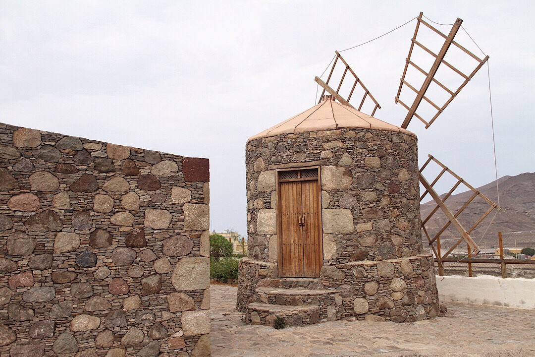Aber die Landschaft bleibt karg und die Planen-Wirtschaft erfreut unser Auge nicht wirklich. Wir halten bei einer kleinen, schön renovierten Windmühle (neben der auch das trockene Wasserbecken liegt). Leider ist das angeschlossene Ein-Raum-Mini-Museum geschlossen. Rätsel gibt uns auch auf, dass wir häufiger mitten im trockenen Berghang Schilf und Kakteen direkt beieinander sehen, es ist offenbar nicht immer so trocken wie jetzt.