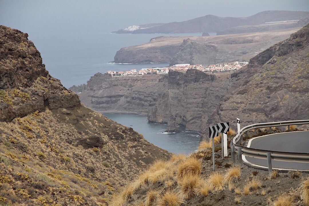 Am Ende der oft durch Tunnel verlaufenden Autobahn schrauben wir uns über Serpentinen auf einer schmalen Straße hinunter nach Puerto de Las Nieves bei Agaete, einem kleinen, ziemlich touristischen Fischerort, deren größte Sehenswürdigkeit, die „Dedo Del Dios“ (Finger Gottes) genannte Felsnadel allerdings schon vor einigen Jahren abgebrochen und ins Meer gestürzt ist. Wir essen in dem heute hauptsächlich als Fährort nach Teneriffa bekannten Fischerdörfchen (natürlich Fisch) und fahren dann an Las Palmas vorbei in einem großen Bogen auf der Autobahn Dreiviertel um die Insel herum schneller zurück, als wir für das erste Viertel hierhin über die gebirgige Küstenstraße gebraucht haben.