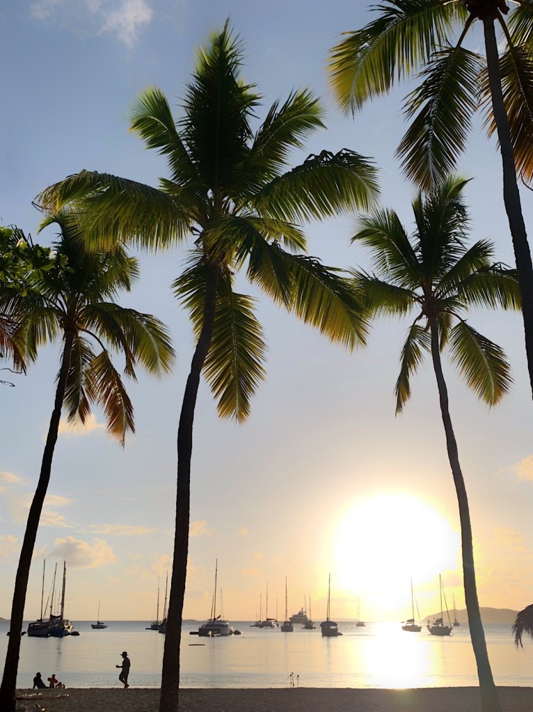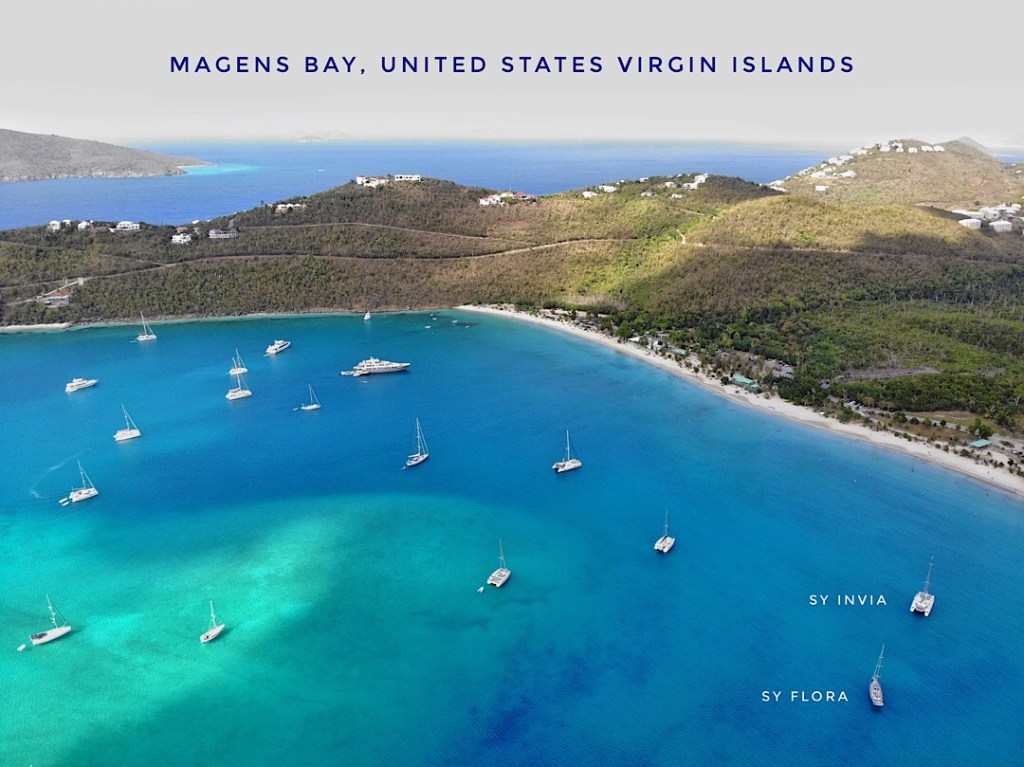 Ist schon frech und ein bisschen kitschig, die südwestliche Bucht auf Water Island so zu nennen. Aber Jasmine und Andy, die mit ihrer kleinen Tochter auf ihrem Boot Laya schon einige Zeit in den USVI sind (wieder Schweizer und wieder schon seit einiger Zeit über Facebook in Kontakt) sagen uns, es sei eine wirklich schöne Badebucht. Wir verabreden uns für den Nachmittag dort. Wir fahren dort schon mal vorbei, als wir die Flora das kurze Stück von dem aktuell etwas unruhigen Ankerplatz vor Yacht Haven Grande zu dem geschützteren Bojen- und Ankerplatz westlich von Water Island verholen. Gut geschützt, aber auch ziemlich voll mit Bojenplätzen. Dafür aber super klares Wasser und ein feiner Sandstrand mit Palmen, was außerhalb von Hotelanlagen auch in der Karibik (soweit wir sie bisher bereist haben) gar nicht mal so häufig ist.