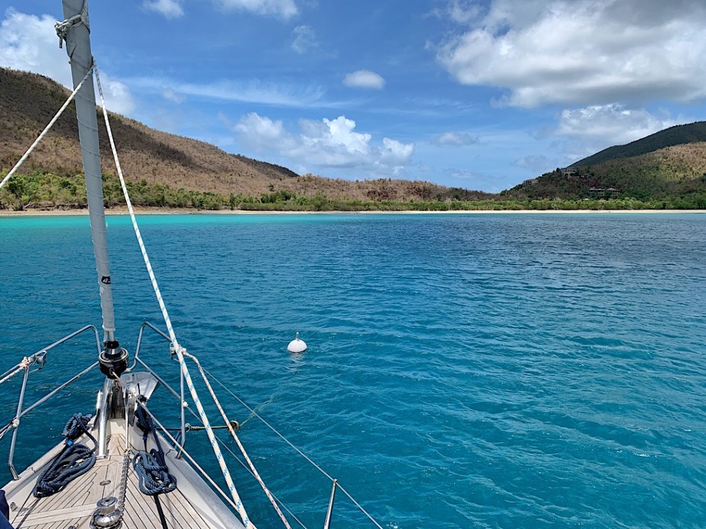 … man kann auch einfach abwarten, bis eine bessere Konstellation die Wahrscheinlichste ist. Machen wir. Und dadurch bekommen wir einen Aufenthalt in einer Traumbucht geschenkt. Denn wir segeln (na ja, motoren!) hinüber nach St. John und legen uns erst einmal an eine Boje in der Francis Bay. Schön hier. Und nur wenige der hier im Nationalpark ausgelegten und verpflichtend zu nutzenden Bojen sind belegt. Das war noch vor einer Woche ganz anders, aber ab dem 15. Mai wurde die zuvor wegen Corona ausgesetzte Regelung zu den maximalen Liegezeiten erneut in Kraft gesetzt. Nun ist es wieder so, dass Boote höchstens eine Woche am Stück in einer Bucht und insgesamt pro Jahr im Nationalpark maximal 30 Tage liegen dürfen. Das haben viele Boote jetzt längst ausgeschöpft und deshalb notgedrungen in Buchten außerhalb des Nationalparks verholt oder die USVI ganz verlassen.