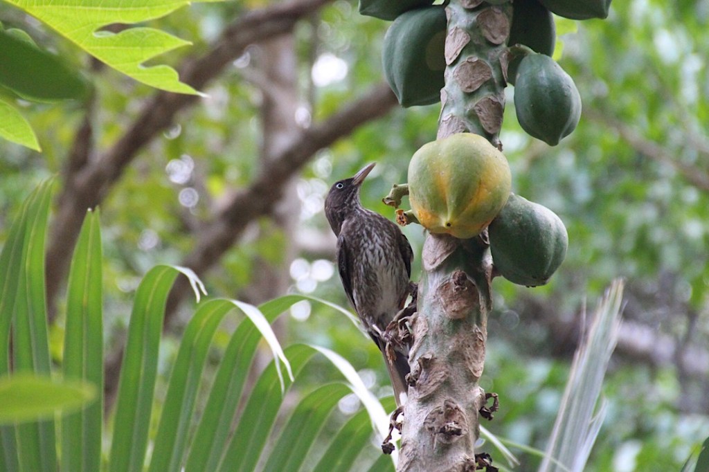Und noch eine zweite Pflanze kommt erstaunlich häufig vor. Mitten im Wald, an den unzugänglichsten Steilhängen wachsen Papayas. Wie uns Locals erzählen, hat die Verbreitung nach dem letzten Hurrikan deutlich zugenommen. Das finden vor allem die Vögel klasse, hier tut sich eine Perlaugen-Spottdrossel an der Frucht gütlich: