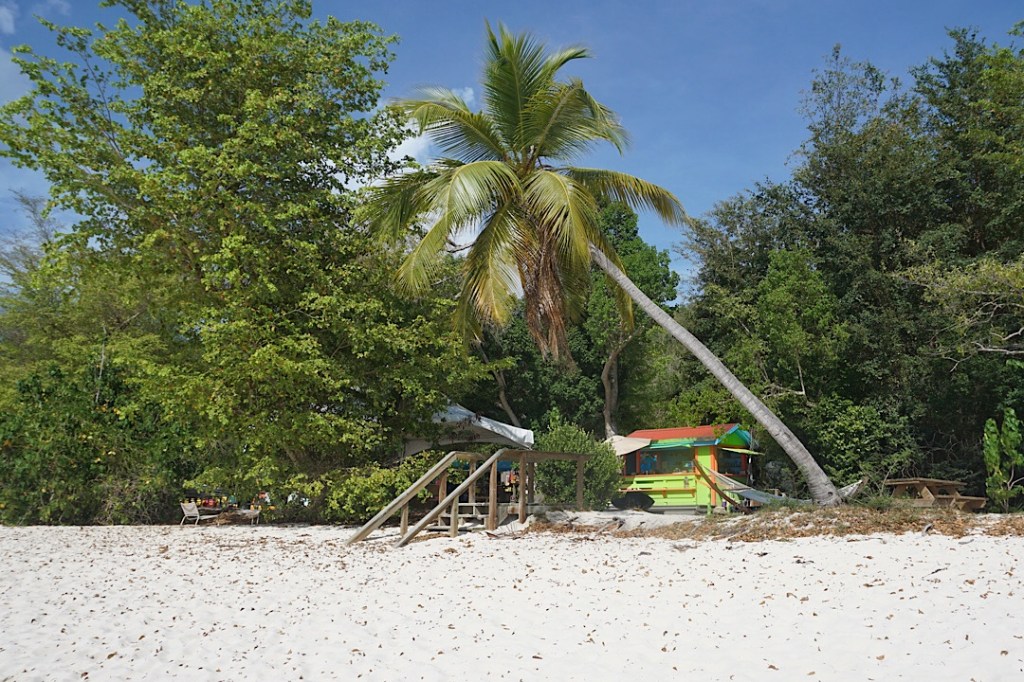 Es bleibt dabei, wir haben die Cinnamon Bay fast für uns allein. Der Campingplatz hinter den Palmen am Strand ist gesperrt, das dazugehörige Restaurant wurde ebenso wie das Infogebäude des Nationalparks offenbar beim letzten Hurrikan schwer beschädigt und sind nicht nutzbar.