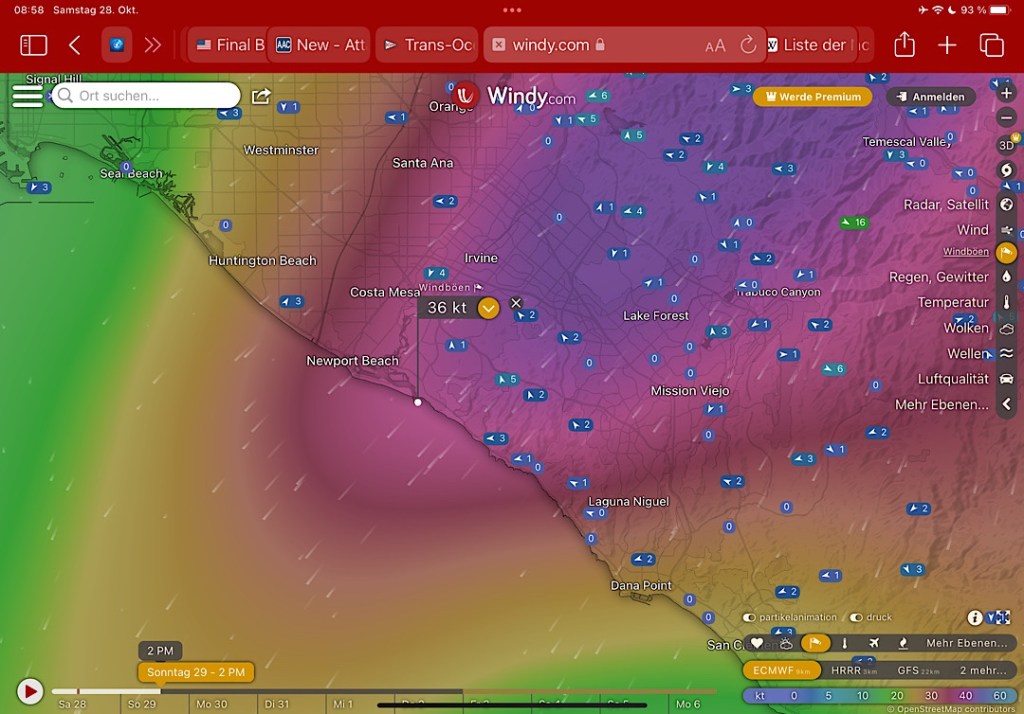 Immerhin: noch liegen die Berge ziemlich im Dunst. Und tatsächlich, die Vorhersage auf Windy verschiebt die Ankunft der starken Winde ein paar Mal, nach jetzigem Stand beim Vorhersagemodell ECMWF sollen sie erst am Sonntag Vormittag unseren Ankerplatz in Newport Beach erreichen.