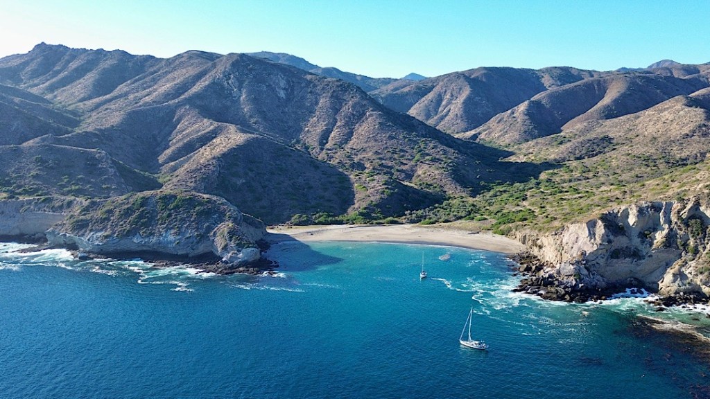 Wir wählen den Ankerplatz östlich der beiden Felsnadeln, aber auch vor dem Sandstrand westlich könnte man liegen. Dort allerdings ist dann ein zusätzlicher Heckanker unerlässlich. Nach den mäßig guten Erfahrungen auf Galápagos (auf der namensgleichen Insel Santa Cruz) üben wir das Liegen zwischen Bug- und Heckanker lieber mit mehr Raum für Flora zum Herumschwingen. Eine weise Entscheidung, denn mitten in der Nacht müssen wir den nicht mehr haltenden Heckanker aufholen, damit sich die Ankerleine nicht um Ruder oder Kiel wickeln kann.