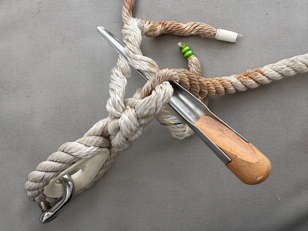 Wir ersetzen die zugegeben etwas kurze Ankerleine des Heckankers durch 40 m geschlagenes Tauwerk, das sich noch tief unten in der Backskiste findet, allerdings das kleine Projekt eines Augspleißes mit Kausch nach sich zieht.