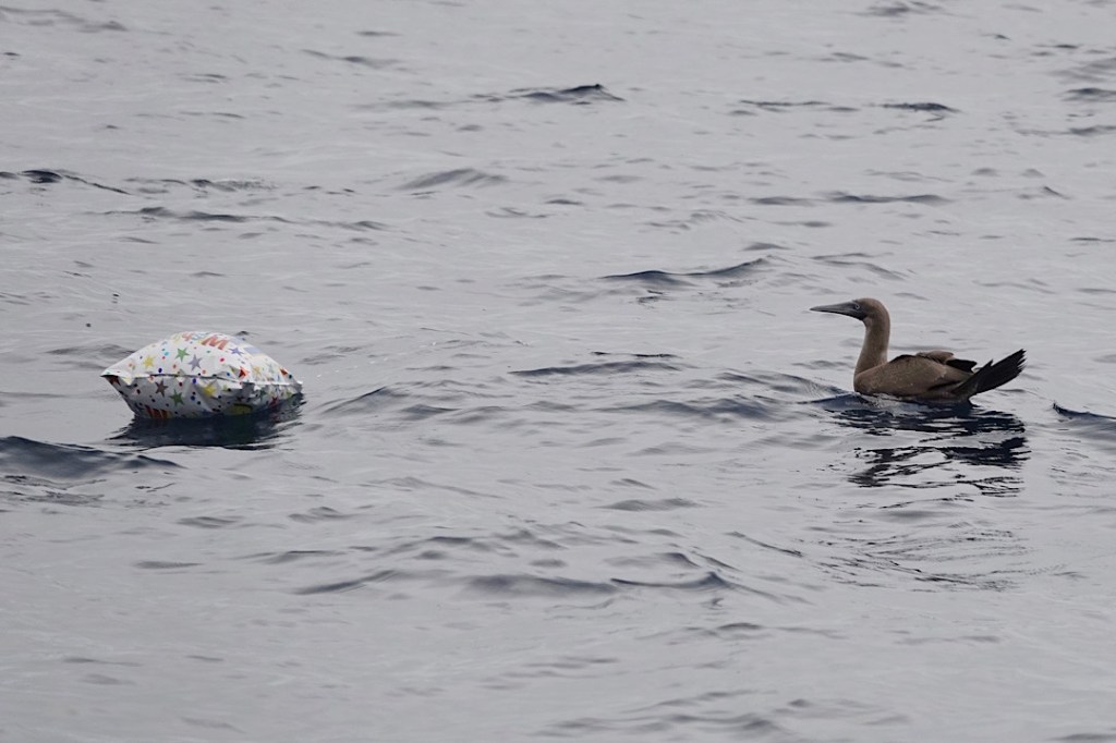 Außerdem sehen wir erstmals wieder Boobies (Brauntölpel), ein Zeichen, dass wir weiter nach Süden kommen. Einer dieser eleganten Gleiter umkreist lange unser Boot und lässt sich dann neben einem im Wasser gelandeten Geburtstagsballon nieder. Es ist wirklich eine Pest mit diesen Ballons, die immer wieder als zusätzlicher Müll im wahrsten Sinne im Ozean landen.