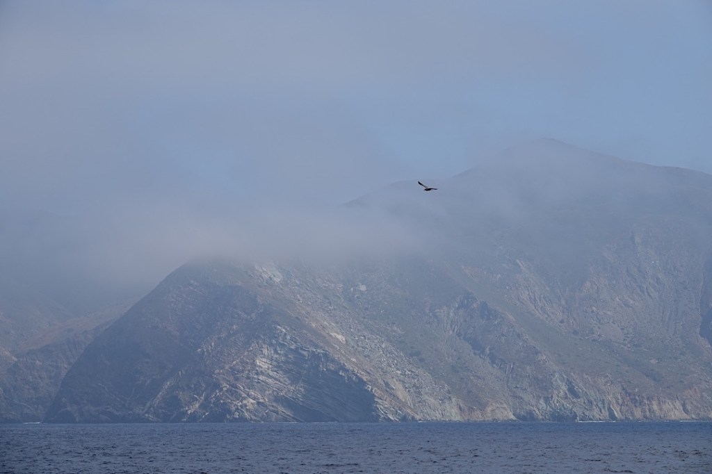 Obwohl Catalina fast 650 m hoch reicht, können wir sie von Santa Barbara aus nicht sehen und das bleibt auch auf der Überfahrt lange Zeit so. Erst als wir sie fast schon erreicht haben, schälen sich steil abfallende Felshänge aus den Nebelwolken.