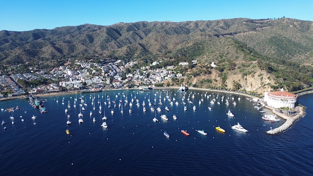Avalon zieht sich wie ein Amphitheater den Hang hinauf um eine halbkreisförmige, mit kurzen Molen zusätzlich geschützte Bucht. Dieser ruhigere Bereich ist dicht an dicht mit nummerierten Mooringtonnen belegt. Im Buchteingang meldet man sich am roten Harbor Patrol Boot an und bekommt eine für die Schiffsgröße passende Boje zugewiesen. Die Moorings sind so eng gesetzt, dass es eines besonderen Systems bedarf, das wir so auch noch nicht hatten: