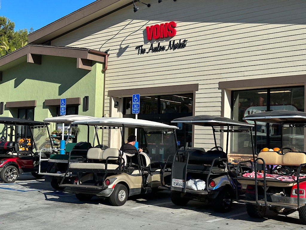 Gelegentlich wird Avalon als „fast autofrei“ beschrieben, aber das beruht auf einem Missverständnis. Tatsächlich hat die Stadt die Zulassung von Autos mit Verbrennungsmotor auf rund 700 (bei über 4.000 Einwohnern) beschränkt, es gibt eine lange Warteliste, 14 Jahre werden kolportiert. Allerdings: Golfcarts sind davon nicht betroffen und es gibt hier knapp 1.500 davon, auch Autos unter einer Gesamtlänge von 3,05 m sind ausgenommen, Smarts und ähnliche sind also ebenfalls sehr beliebt. Der Parkplatz vor dem Supermarkt sieht jedenfalls so aus: