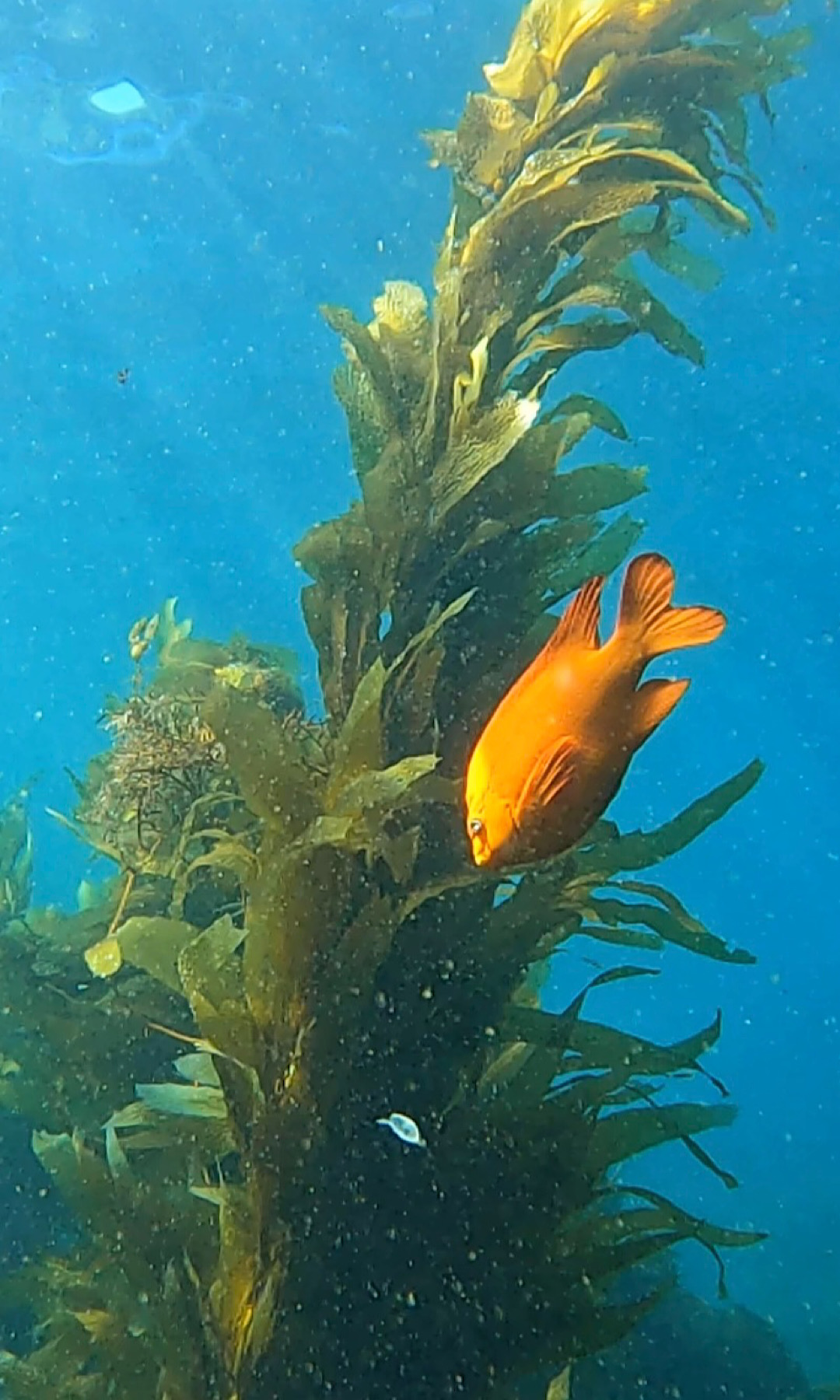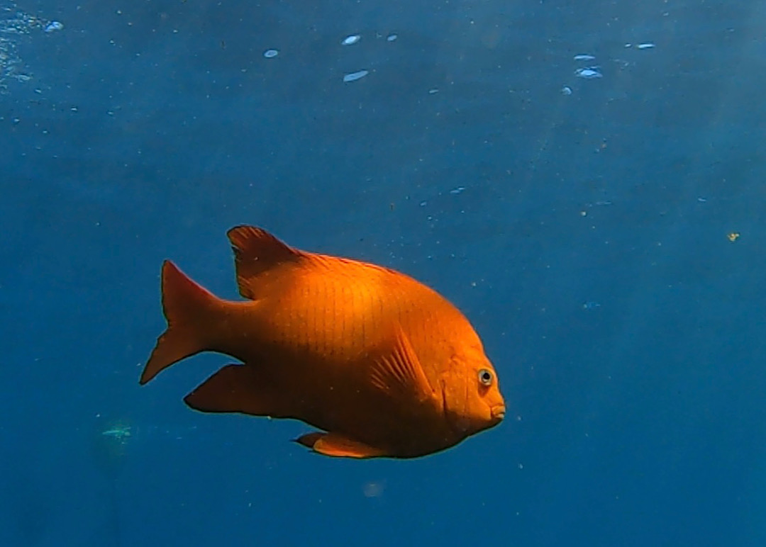 Angenehme Überraschung für uns: das Wasser ist mit 22 Grad vergleichsweise warm und außerdem wunderbar klar. Nach erheblichen Schwierigkeiten mit der Wasserqualität noch im letzten Jahrzehnt war die Stadt Avalon (wenn auch erst durch mehrere angestrengte Verfahren) gezwungen, erheblich in ihr Abwassersystem zu investieren. Wir bekommen auch wieder eine Färbetablette in die Toilette. Inzwischen gelten die Strände und Gewässer nicht mehr als verschmutzt und die Tauch- und Schnorchelplätze erfreuen sich großer Beliebtheit. Direkt am Casino ist ein abgetrennter Tauch- und Schnorchelbereich. Das lassen wir uns nicht entgehen. Erstmals schnorcheln wir in einem Kelpwald. Ein ganz besonderes Erlebnis, zumal sich hier neben kleinen Schwarmfischen, Grünlingen und anderen Fischarten auch Garibaldi-Fische darin tummeln. Diese mit über 30 cm ziemlich großen leuchtend orangefarbenen Riffbarsche sind eine Besonderheit dieser Meeresregion und sorgen für wunderbare Farbkontraste im grün-braunen Kelp.