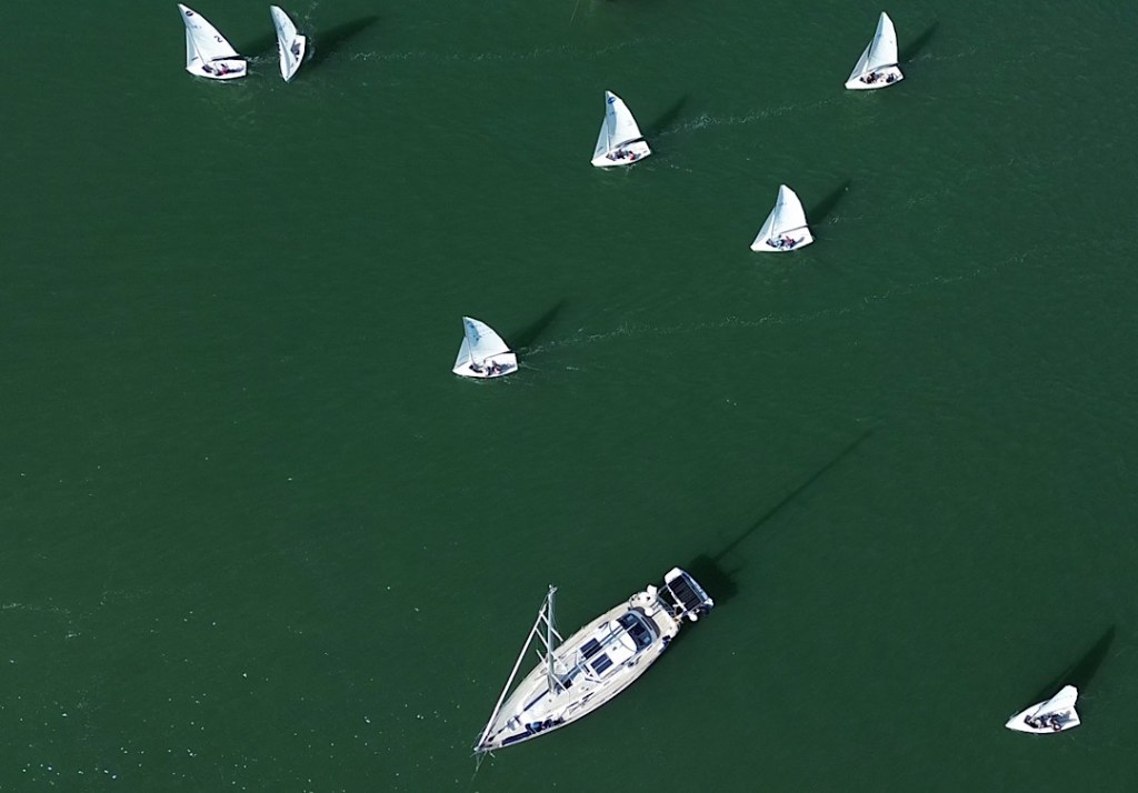Um Flora herum, quer durch den Ankerplatz und auch mitten durch die Bojenfelder, findet eine große Jollen-Regatta statt.