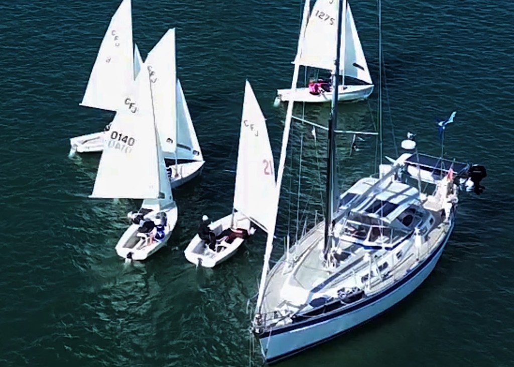 Spannend anzuschauen, ein ums andere Mal scheinen die Jollensegel Floras Bordwand putzen zu wollen, aber die Jugendlichen sind offenbar keine Anfänger. Die CFJ-Zweipersonen-Jollen wuseln einige Male dicht um uns herum, aber sie berühren uns trotz des Regattafiebers ihrer Besatzungen nicht.