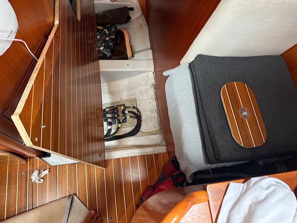 Insgesamt haben wir theoretisch 830 Wattpeak an Solar, davon 430 durch das große Panel auf den Davits an Floras Heck.