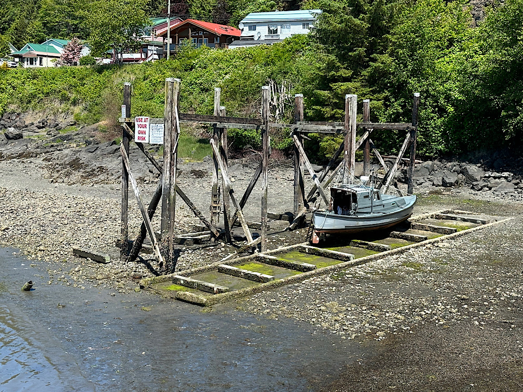 Bag Harbour liegt am Südausgang der Dolomite Narrows, die Burnaby Island mit ihrem schmalen Durchfluss zur Insel machen. Oder jedenfalls zur Teilzeit-Insel, den die Narrows fallen bei starker Ebbe trocken. Wir bleiben einen Tag und erkunden die Narrows mit dem Dinghy. Danach sind wir sehr froh, die Durchfahrt nicht mit Flora versucht zu haben. Zwar würde die Wassertiefe bei Hochwasser wohl gerade so eben ausreichen, aber eben nur in der Fahrrinne. Die aber windet sich zwischen scharfkantigen Felsen hindurch und wird nur durch wenige Peilmarken an Land gekennzeichnet.