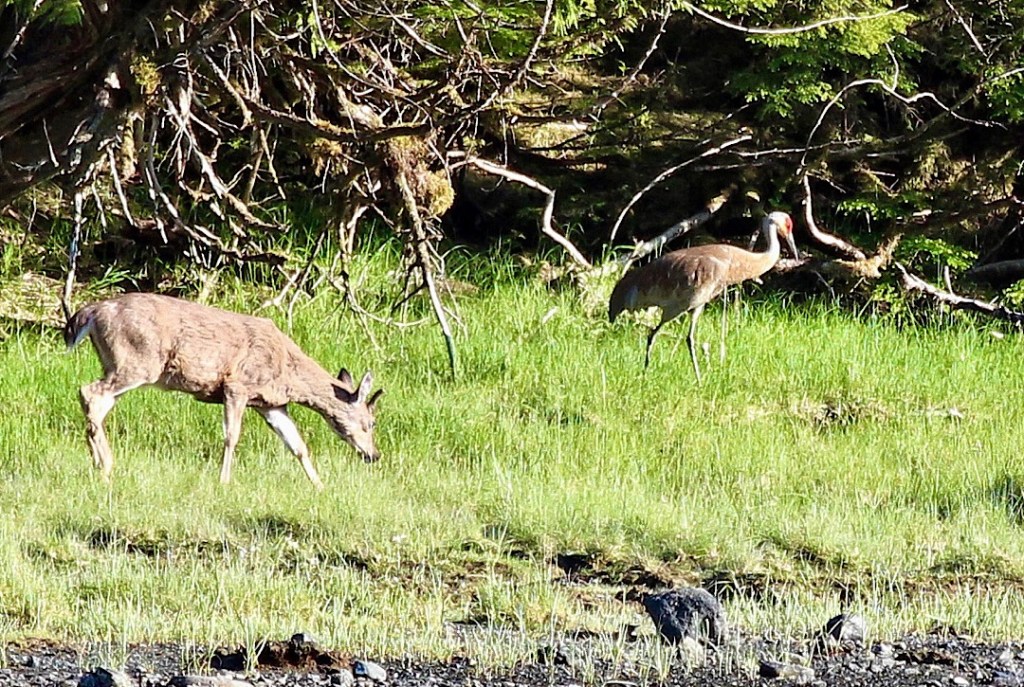 In der Sac Bay können wir neben den Sitka-Hirschen erstmals auch Kanada-Kraniche am Ufer beobachten (und ihren charakteristischen Schrei hören).