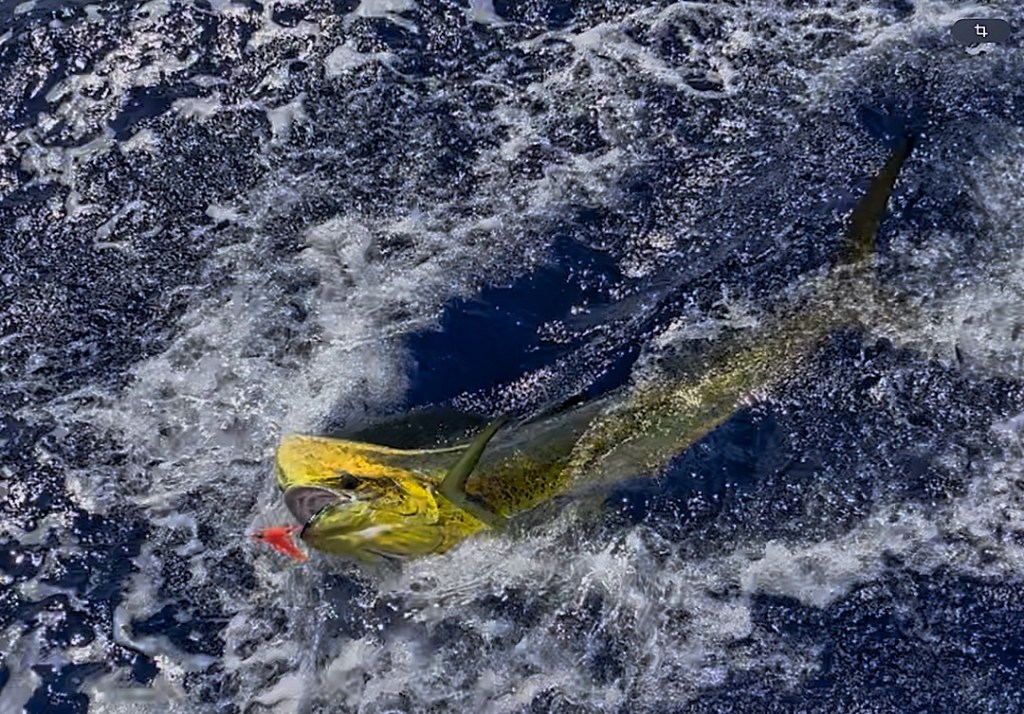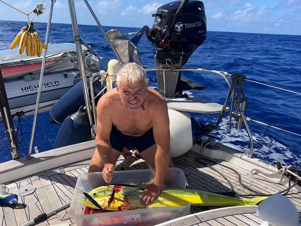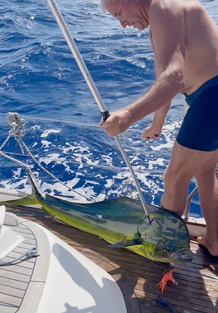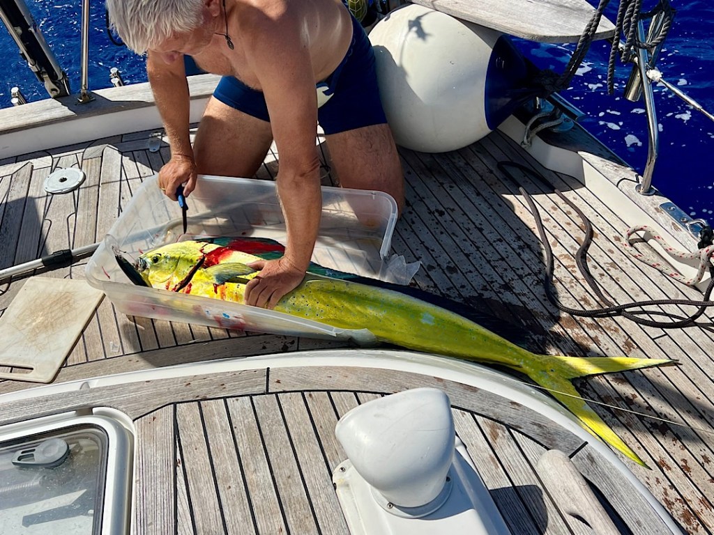Wir bekommen beide Fische tatsächlich an Bord, es sind jeweils kapitale Mahi Mahi. Allerdings schaffen wir das nicht ganz ohne Schwund: die vorsorglich herausgestellte altbewährte Plastikwanne (zum Ausbluten und Filetieren) ist viel zu klein und gleich der erste Mahi Mahi zertrümmert sie schon vor dem Hineinlegen mit einem Schwanzschlag. Beim zweiten Mahi Mahi bricht dann unser altes Gaff (ein Haken an einem Stiel, mit dem große Fische an Bordgehievt werden). Zum Glück erst, nachdem der Mahi Mahi schon auf dem Achterdeck zappelt.