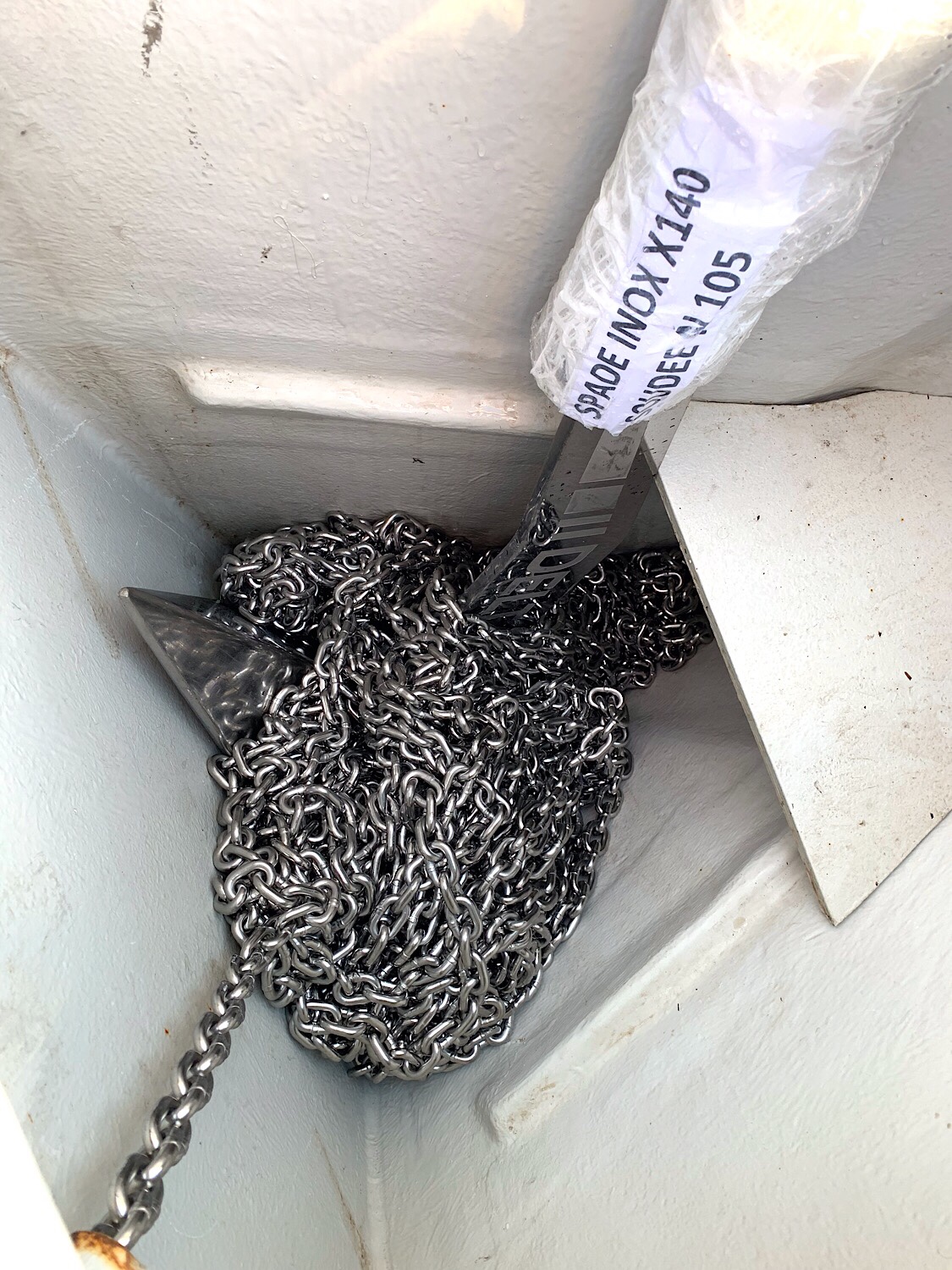 Zum einen rauscht die Kette komplett aus. Das dürfte eigentlich nicht passieren, denn das Ende (the bitter end) der Kette ist mit einem Stück Leine im Ankerkasten befestigt. (Leine deswegen, damit man sie im Notfall einfacher kappen kann). Nur: der Edelstahlschäkel am Ende ist einfach durchgerostet. Hätten wir bei großer Wassertiefe versehentlich die Kette ganz ausgebracht, hätten wir jetzt Anker und Kette verloren.