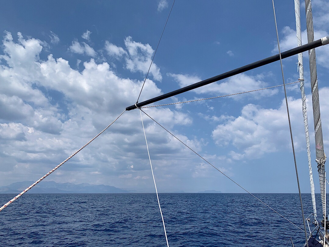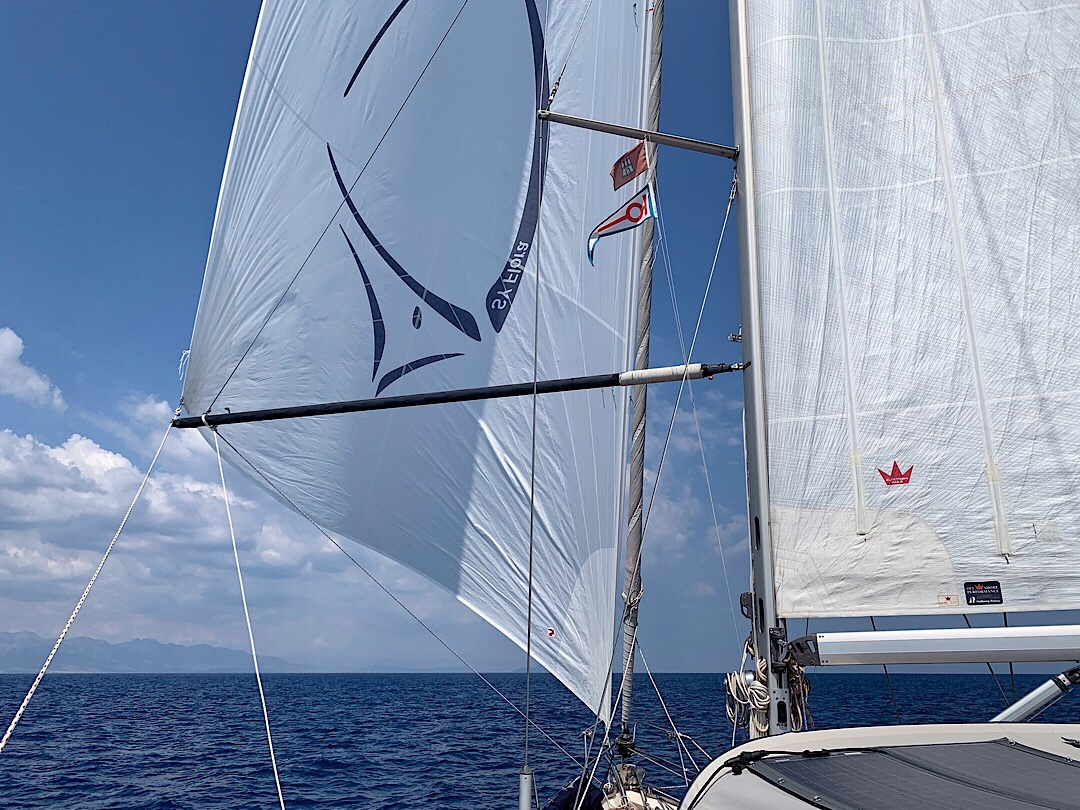 Bei wahrem Wind unter 20 kn rollen wir an Backbord zusätzlich den Code0 aus und nehmen dafür das Großsegel weg. Der Vorteil liegt nicht nur in der größeren Segelfläche des Code0 gegenüber dem Großsegel, sondern vor allem in einem etwas verminderten Rollen des Bootes und einem geringeren Arbeitspensum (und damit auch Stromverbrauch) unseres elektrischen Autopiloten.