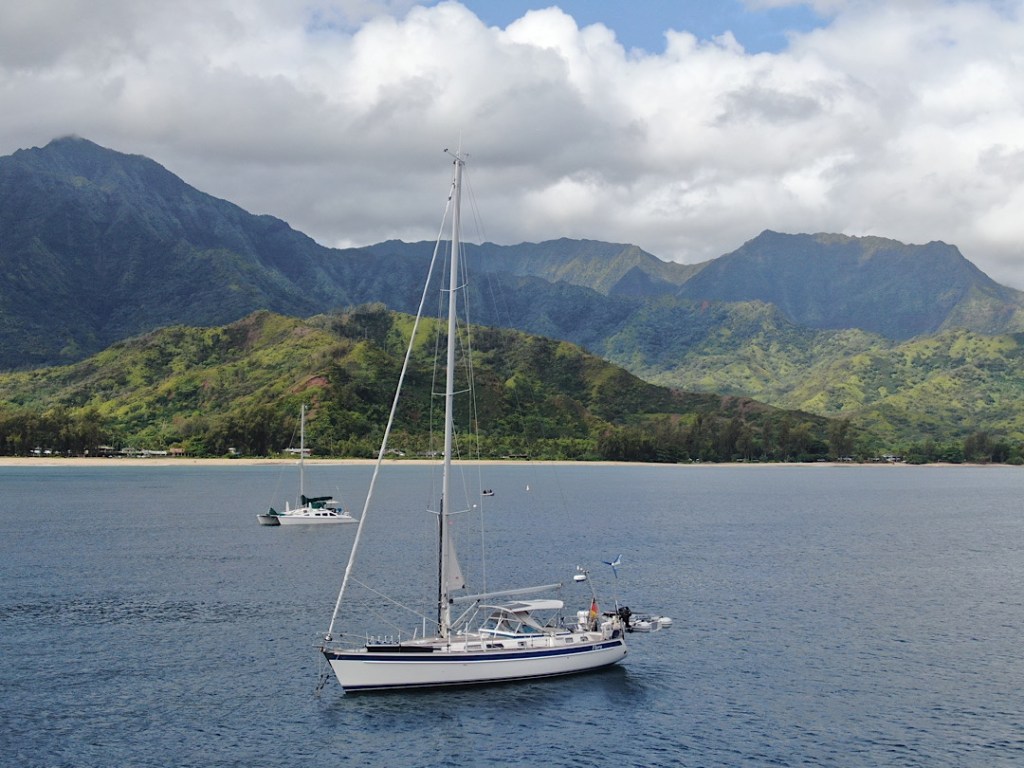Tatsächlich finden wir sein Boot weit draußen in der Bucht, wo der heute sehr frische Wind die See schon ziemlich aufgewühlt hat. Nur ein Frachter und Zweimaster-Katamaran ankern hier draußen.