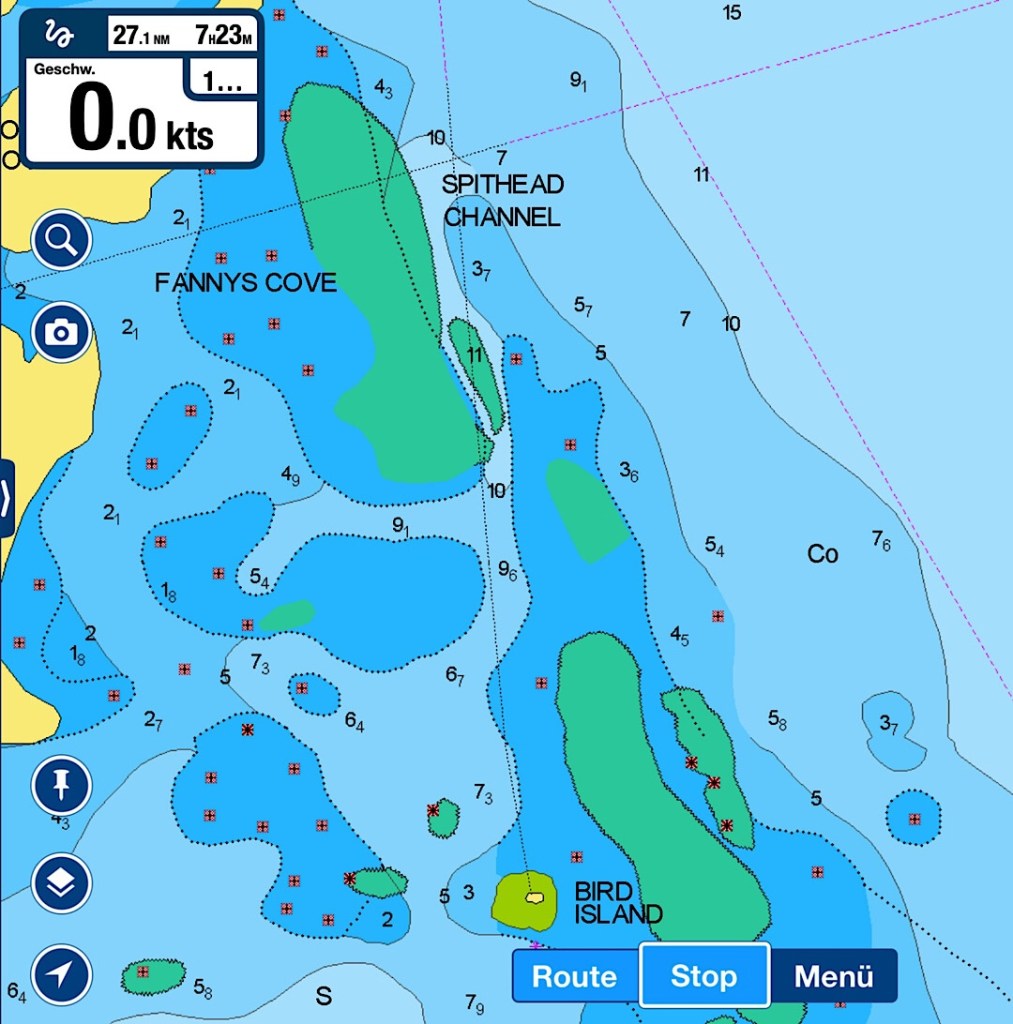 Für den Start haben wir uns eine kleine Komplikation ausgewählt, wir möchten die Nonsuch Bay durch den Spithead Channel nach Norden verlassen. Auf der Navionics-Seekarte sieht das mit den grünen Riffen wenig verlockend aus: