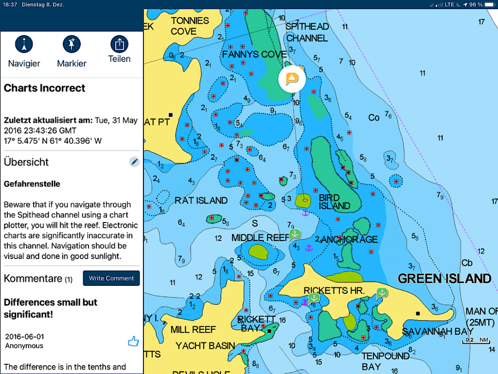 Interessant ist der Hinweis in der Navionics-eigenen “Active Captain Community”, wonach die Karte an dieser Stelle falsch ist: