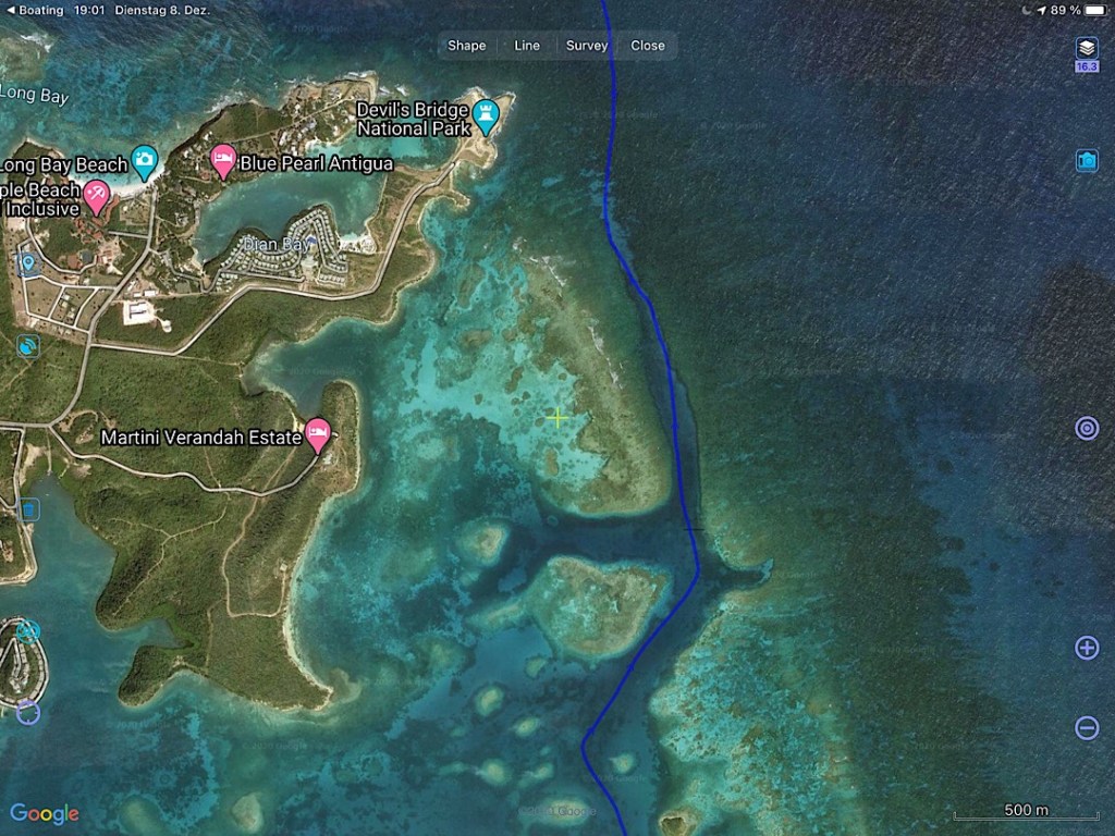 Über die nützliche Georeferenzierung von Google Earth hatte ich bei unserer Passage von Great Bird Island schon geschrieben. Und – der ein oder andere wird es schon erkannt haben – das ist nicht die Originalansicht von Google Earth, sondern die in der App “Ovitalmap” heruntergeladene Offline-Variante. Dort kann man auch Tracks hineinladen, die andere Boote zur Verfügung stellen. Mit unserem (zugegeben nicht optimalen) Track, bei dem wir immer mehr als 5 m Wasser hatten, sieht das in der fraglichen Passage so aus: