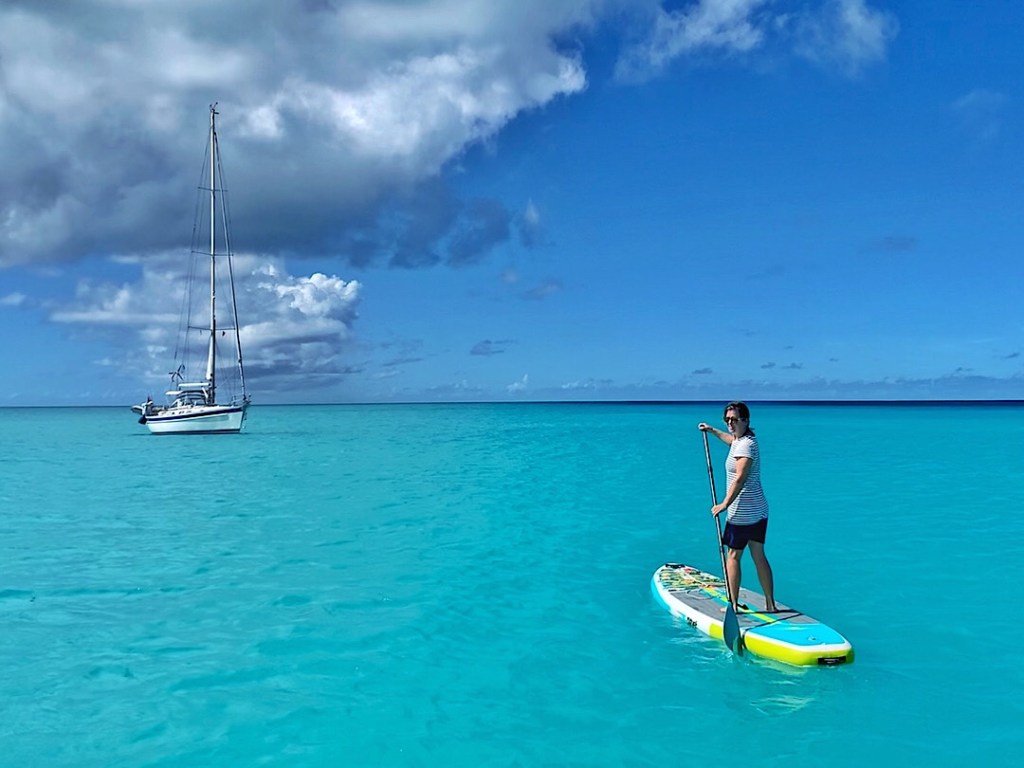 Wir beschränken uns da lieber darauf, mit den Paddelboards auf die sogar mit ein paar Palmen bestandene Landzunge zu fahren und den Strand der Halbinsel zu erkunden, die karibischen Farben und die Blicke hinüber zu unserer Flora auszukosten.