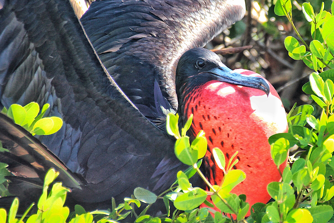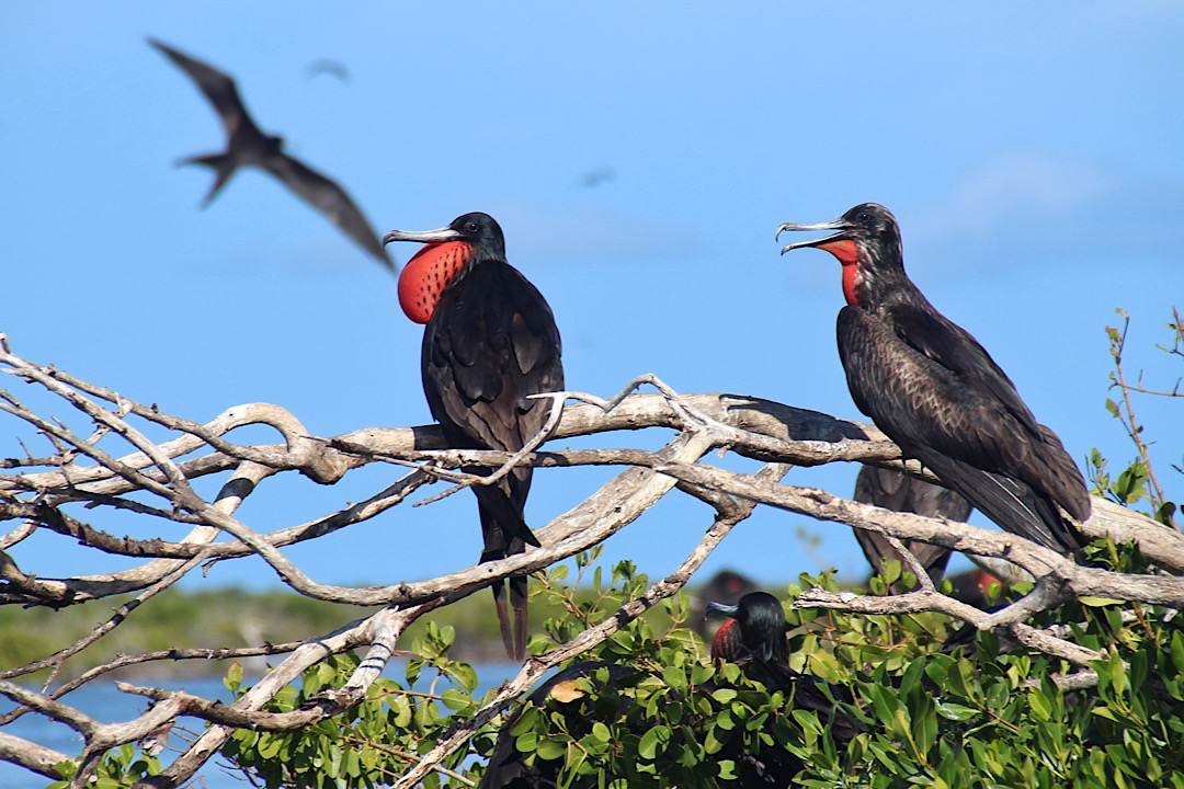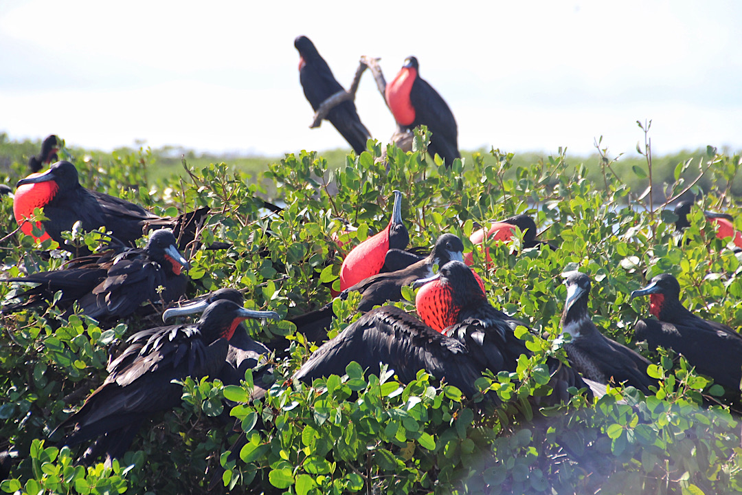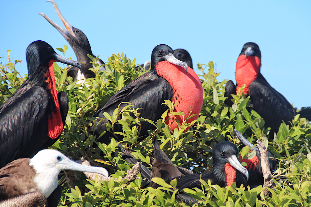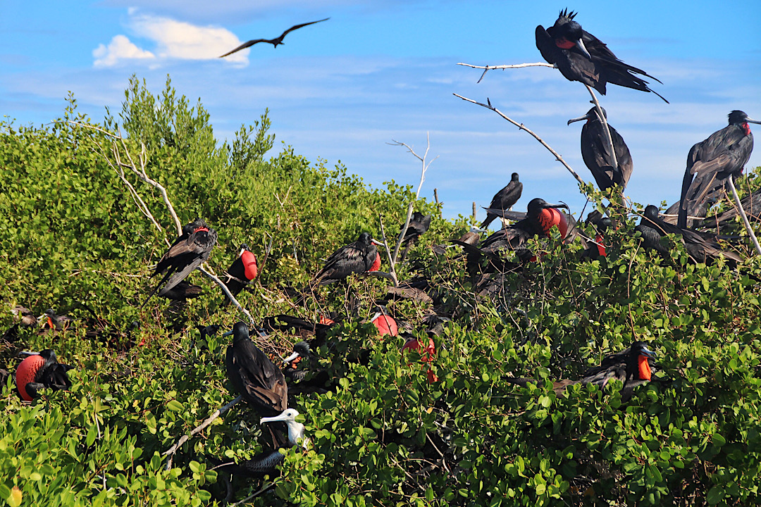 Etwas weiter zeigen sich dann auch die Fregattvögel. In der Balz versuchen die geschlechtsreifen Männchen die Weibchen durch Aufblasen ihres roten Kehlsacks zu beeindrucken.