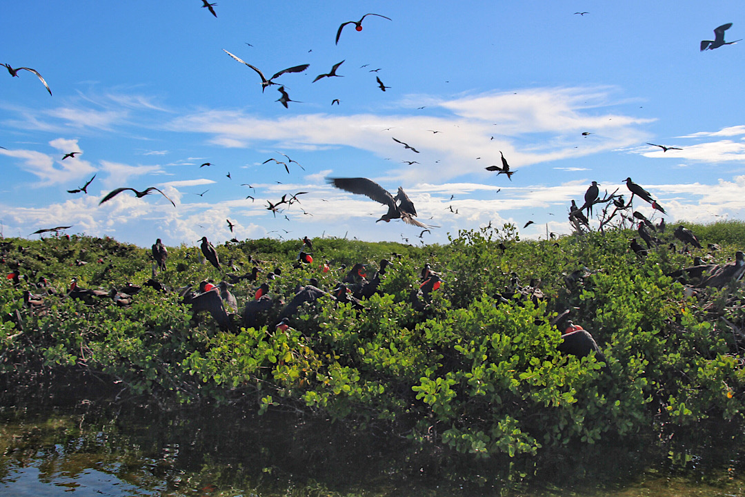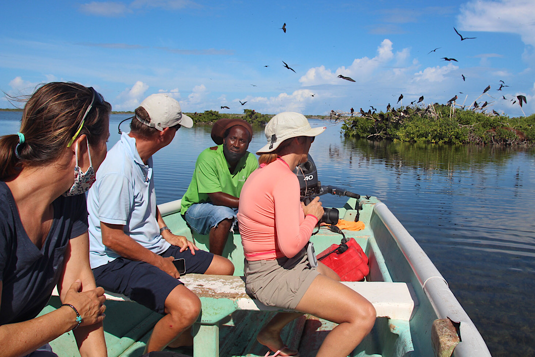 Guide George holt uns mit einem flachgehenden Boot ab und bringt uns in das Schutzgebiet. Auch diese von den Fregattvögeln als Brutgebiet geschätzte Mangrovenlandschaft wurde von Irma schwer getroffen. Sie erholt sich aber und auch die Zahl der dort lebenden Fregattvögel nimmt erstaunlich schnell wieder zu.