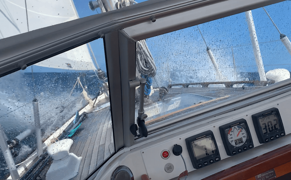 Tatsächlich haben wir maximal 25 kn, das ist doch schon mal besser. Außerdem haben wir das Groß gleich in paar mal gerefft, Außenborder natürlich am Heckkorb, Bellybands unterm Dinghy in den Davits. Geht doch. Ein Spaziergang ist es aber trotzdem nicht: