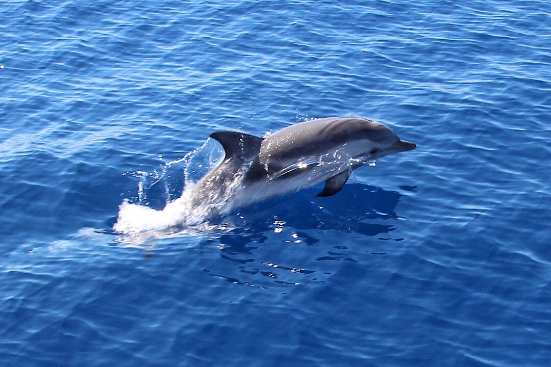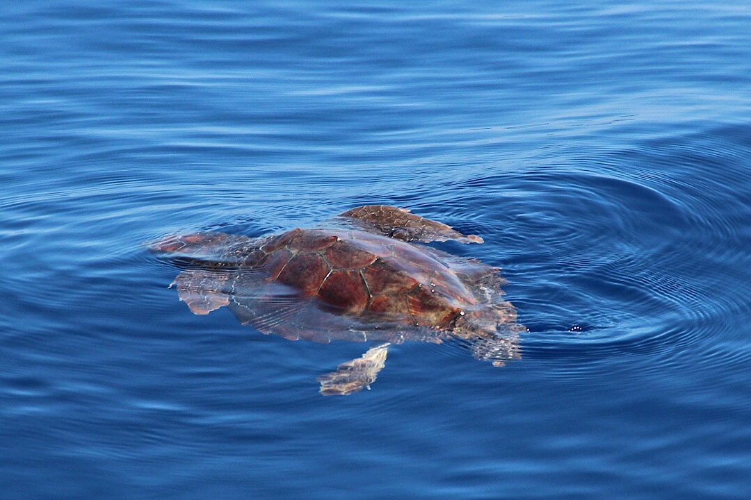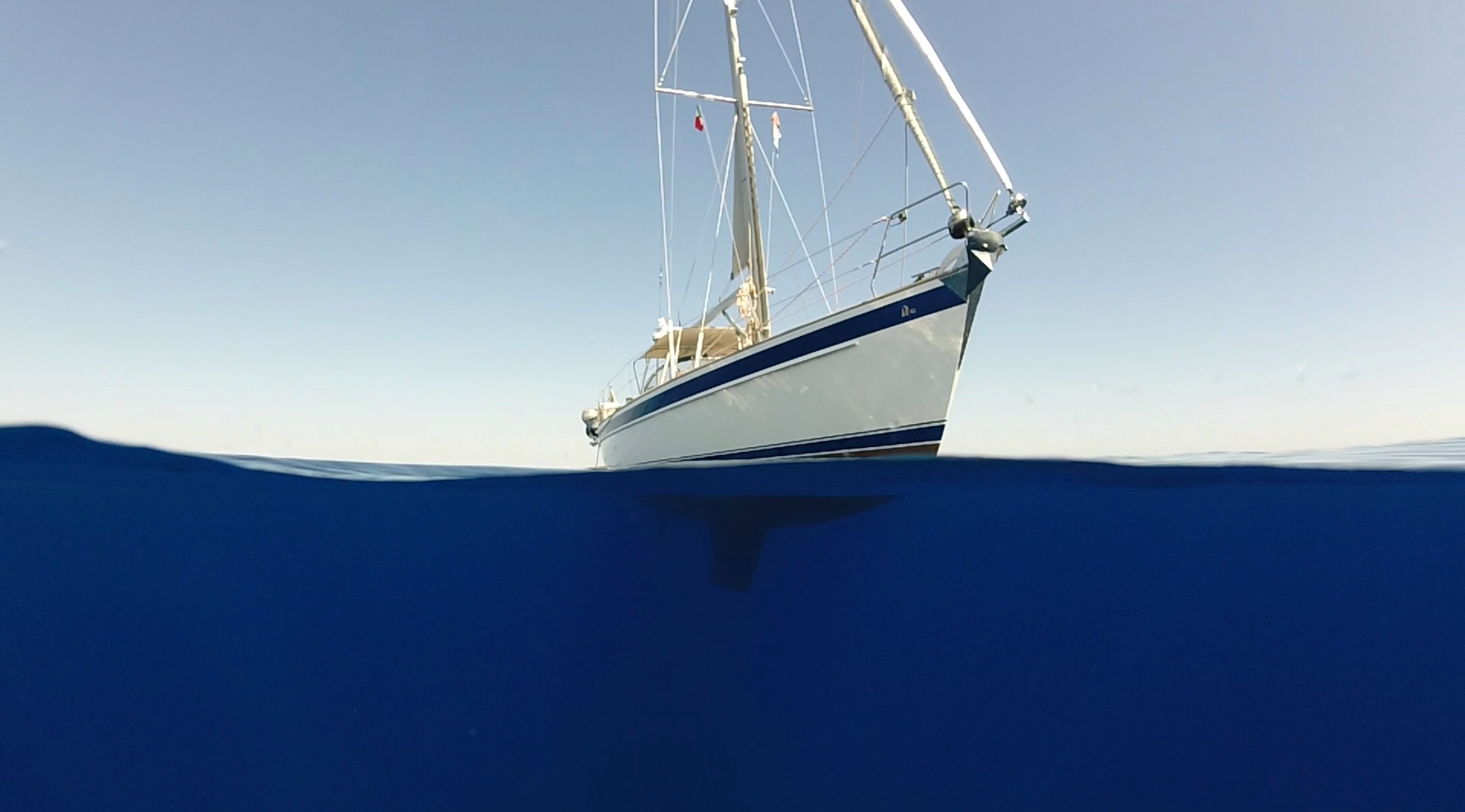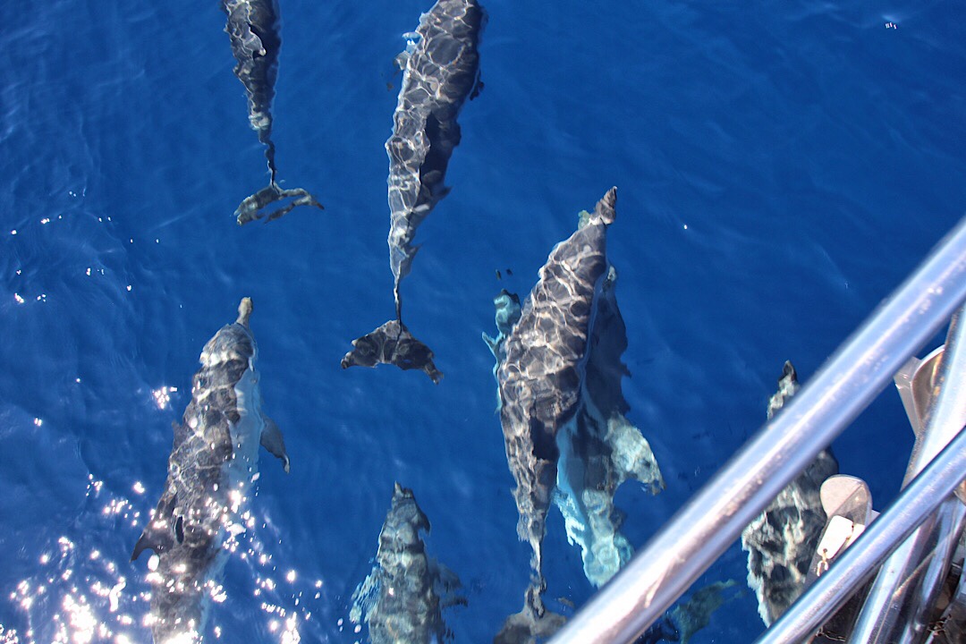 Irgendwann stellen wir den Motor mal ab und nehmen ein Bad in dem dunklen Blau des hier wohl etwa 2.000 m tiefen Wasser. Schon ein komisches Gefühl, aber auch wunderschön, insbesondere weil kurz mal die Sonne durchblitzt und dem kräftigen Blau ein ganz besonderes Strahlen verleiht.