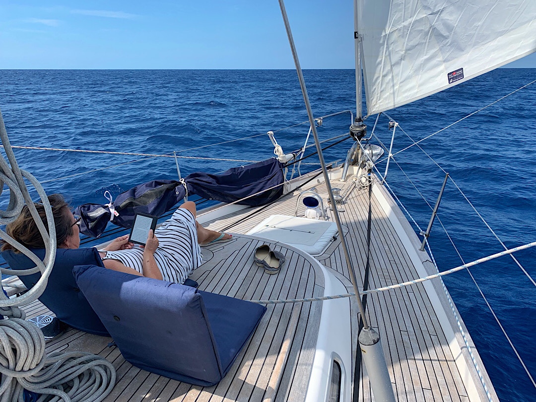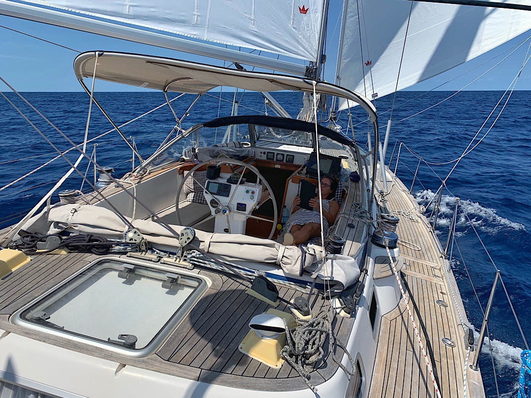 Es bleibt dabei: angenehmes Segeln. Die Windstärke variiert ein bisschen, so können wir unsere Segelgarderobe ausprobieren. Sowohl die Fock als auch der Code0 kommen zum Einsatz, dazu wechseln wir durch verschiedene Reffstufen im Großsegel. Eine kurze Schwachwindphase nutzen wir für ein Bad im offenen, hier über 4.000 m tiefen Pazifik.