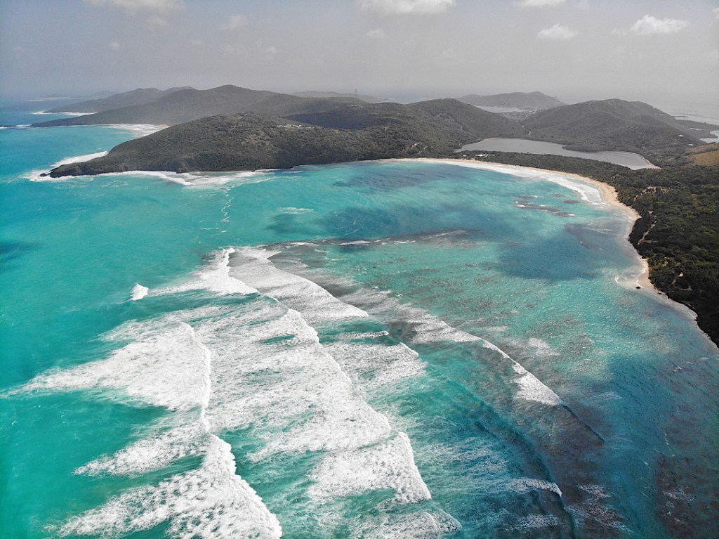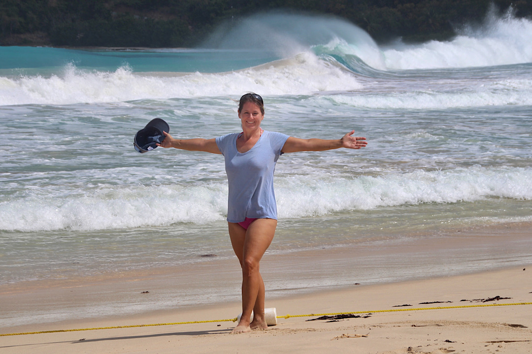 Tatsächlich kann ich den beiden schnorchelnd helfen, wieder freizukommen und neu an der Boje festzumachen. Uns ist es hier aber zu rollig und so gehen wir wieder ankerauf, umrunden auch die Südspitze von Culebra und ankern letztlich in der Bahía de Almodóvar, wieder wunderbar geschützt von dem vorgelagerten breiten Riff. Die Oroboro von Yuka und Francesco ist schon da, die beiden kiten. Kurz nach uns laufen Kim und Chuck mit der La Rive Nord ein. Ansonsten finden jetzt am Wochenende allerdings auch einige Motoryachten von der Ostküste Puerto Ricos hier herüber. Sie machen alle – für uns ungewohnt – mit Heckanker in Richtung Riff (also zum Wind) und Buganker in Richtung Bucht fest. Voll ist es übrigens trotzdem nicht, sogar ein paar Moorings sind noch frei.