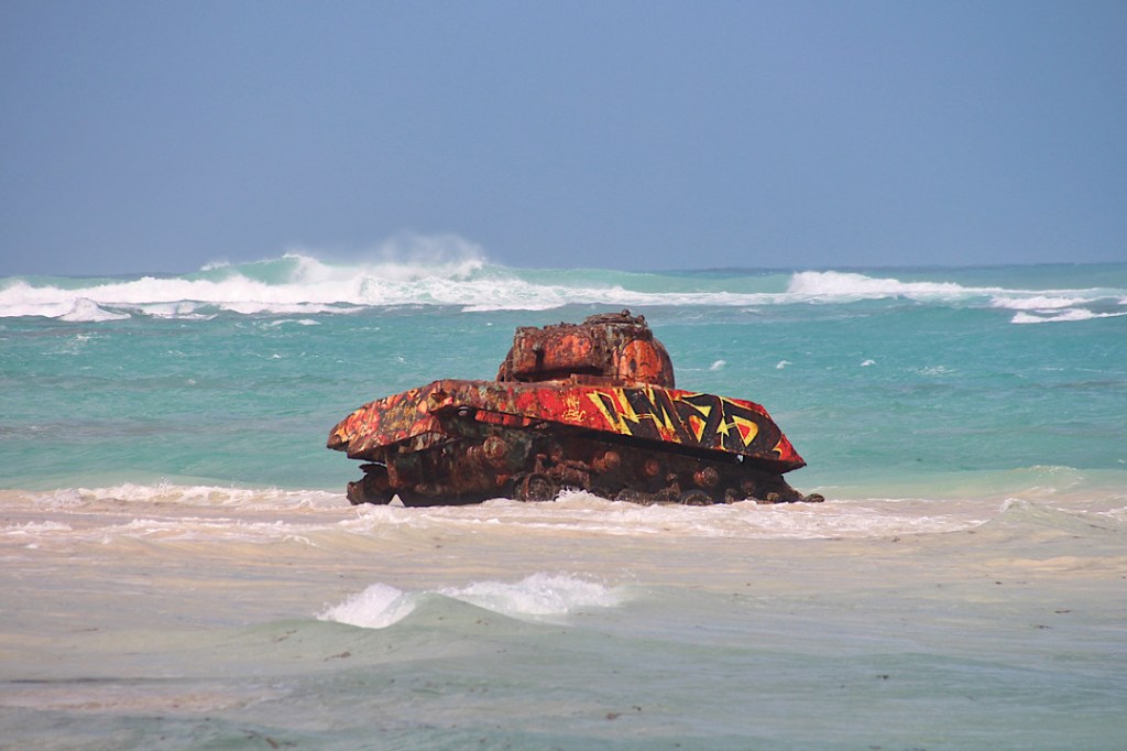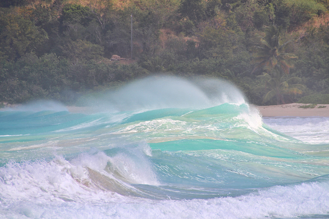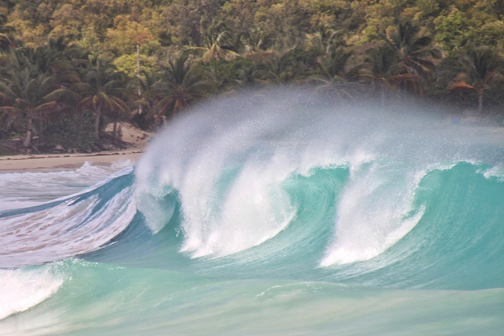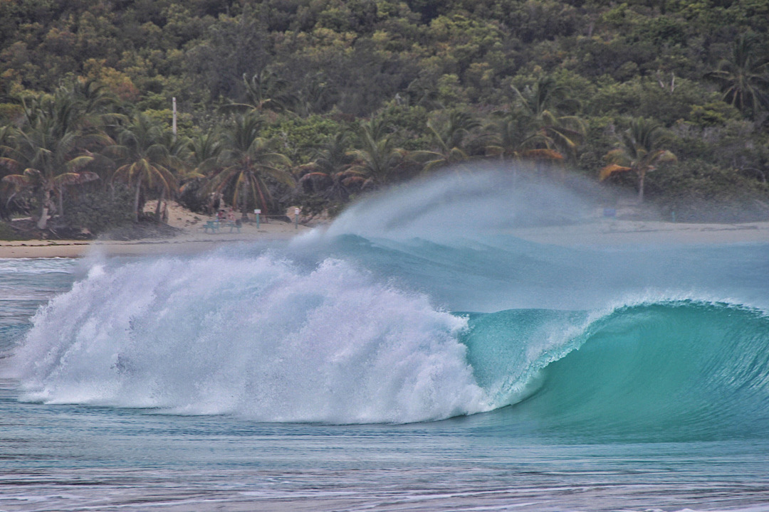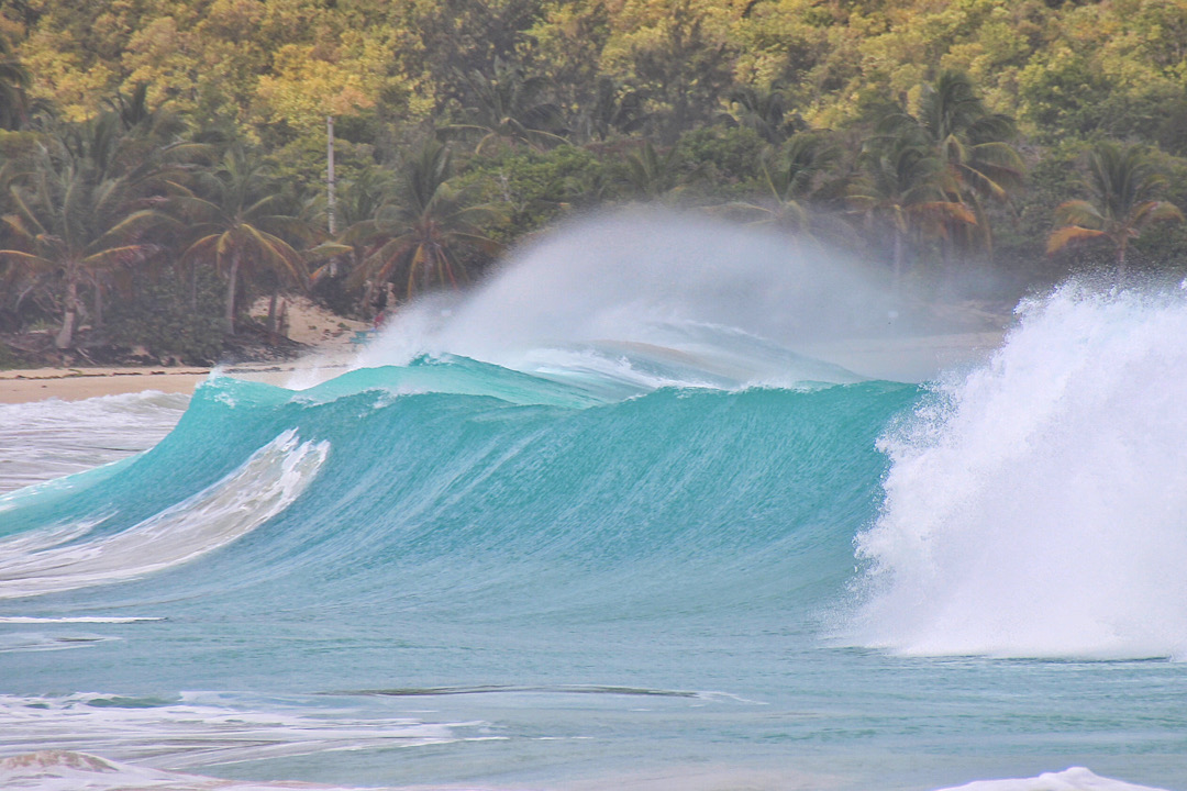 Rund Culebra zunächst mal. Wir verlassen unsere wunderbare Bahia Tortuga auf Culebrita, allerdings nicht ohne vorher noch einmal einen Spaziergang über den Strand hin zu den „Pools“ am Montecito Primero zu machen. Die felsige Nordspitze der Insel wird hier von immer mal wieder durch die Brocken flutenden Wellen quasi abgeschnitten. Dabei bilden sich mehrere Pools, teils ganz ruhig, teils echte Wellenbäder.