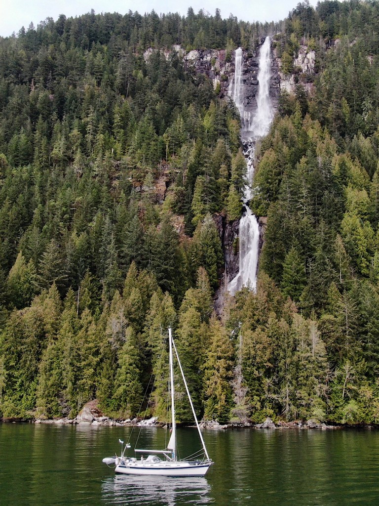 Der Fjord schneidet etwa 50 Seemeilen in das Landesinnere hinein. Eigentlich ist Saltery Bay kurz hinter dem Eingang des Fjords unser Tagesziel. Wir legen auch kurz am Public Dock an, aber kaum sind die Leinen fest, werfen wir sie auch schon wieder los. Trotz Vorsaison ist das Dock dicht belegt, aber entweder mit kleinen Angelbooten oder mit verlassen wirkenden Seglern. Dann doch lieber noch etwas weiter, es ist ja noch früher Nachmittag. Diese Entscheidung erweist sich als Glücksgriff, denn so landen wir für die Nacht im Hotham Sound, einem der vielen Nebenarme des großen Fjordes. Zunächst statten wir noch dem beeindruckenden Freil Lake Fall einen Besuch ab …