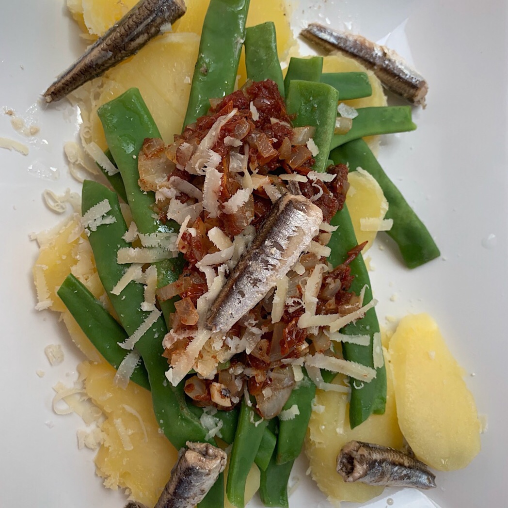 Kartoffeln und Bohnen halten auch lange. Ergänzt mit kleinen Sardinen aus der Dose, Parmesan und getrockneten Tomaten auch lecker.