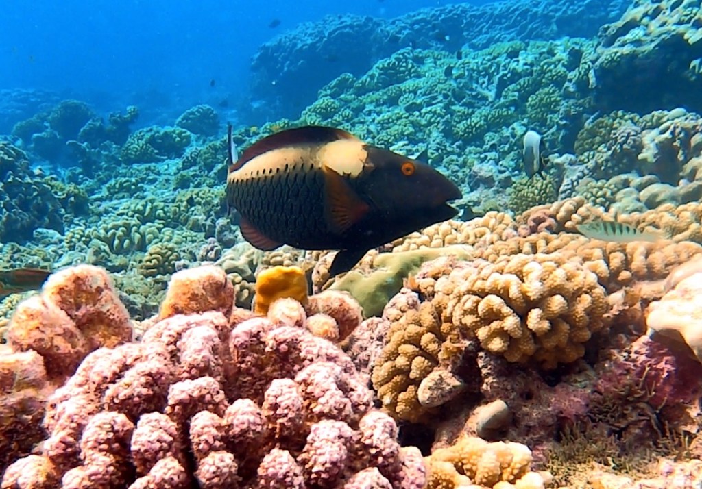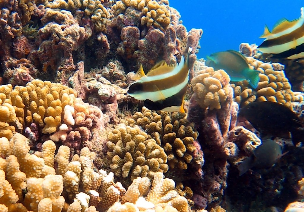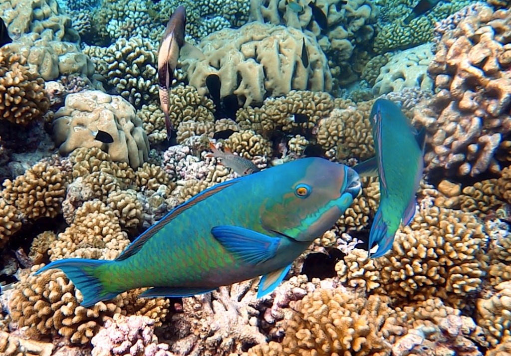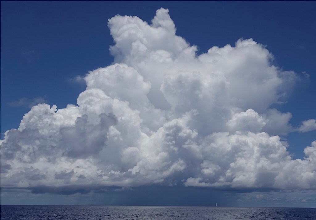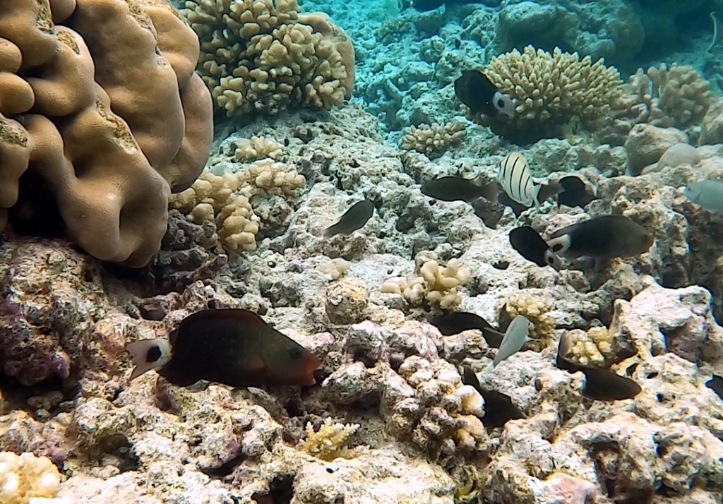 Auch der heutige Morgen bringt uns Tiere direkt ans Schiff. Als wir wach werden, hören wir rund um die Flora herum in kurzen Abständen ziemlich heftiges Plantschen. Ein Schwarm kleiner Fische sucht unter unserem Boot Schutz. Diverse Raubfische versuchen sie vom Rumpf weg an die Oberfläche zu treiben, wo sie sich leichter jagen lassen. Die ins Wasser gehaltene GoPro enthüllt, dass neben Dicklippen-Makrelen einige Blauflossenmakrelen und auch mehrere kleine Thunfische (Wavyback-Skipjacks) zu den Jägern gehören.