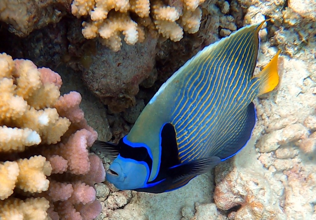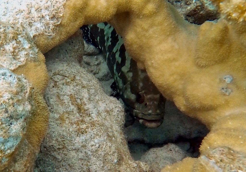 Wäre allerdings nicht sehr gefährlich für uns, denn diese gut einen Meter langen Schlangen haben ein so kleines Maul, dass sie Menschen eigentlich kaum beißen könnten. Und – wichtiger – das Tier sieht wirklich nur sehr ähnlich aus. Tatsächlich bedient sich hier ein gebänderter Schlangenaal der Mimikry. Er imitiert in seiner Erscheinung weitgehend die Seeschlange, ist aber komplett harmlos. Erkennbar ist er vor allem an der Zeichnung am Kopf (Auge im weißen Bereich) und an den gelegentlich vorkommenden schwarzen Punkten in den weißen Bereichen. Das musste ich allerdings erst mal nachschlagen. Diese Schlangenaale lieben flache sandige Flächen in Lagunen und Riffen, aber es ist trotzdem der erste seiner Art, den wir sehen.