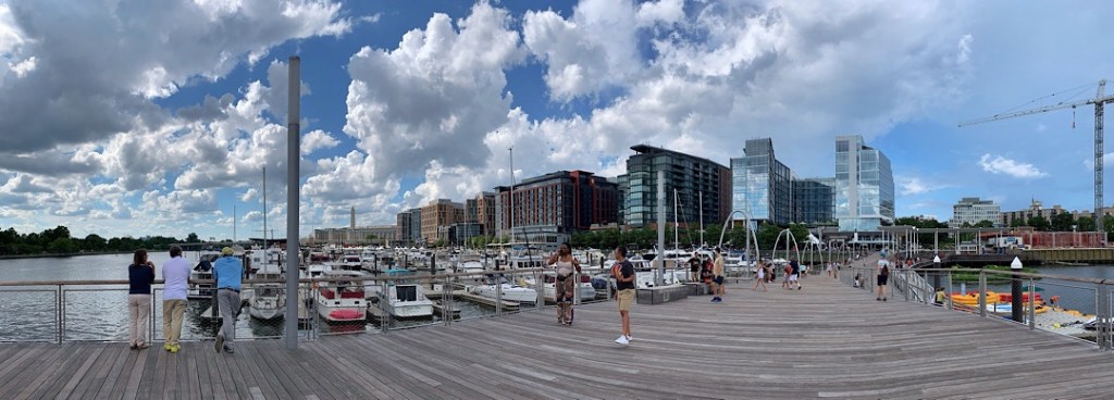 Am Kapitol vorbei gelangen wir am Ende aber dann doch hinunter zum Flussufer. Das moderne Viertel in der früheren No-Go-Area hat eine schöne Promenade vor den neuen Gebäuden am Anacostia River (der kurz darauf in den Potomac mündet) und mehrere weit in den Fluss hinausgebaute Flanierbrücken. Bis hinüber zum alten, denkmalgeschützten Fischmarkt ziehen sich die modernen Fassaden.