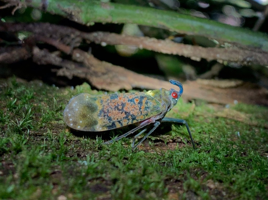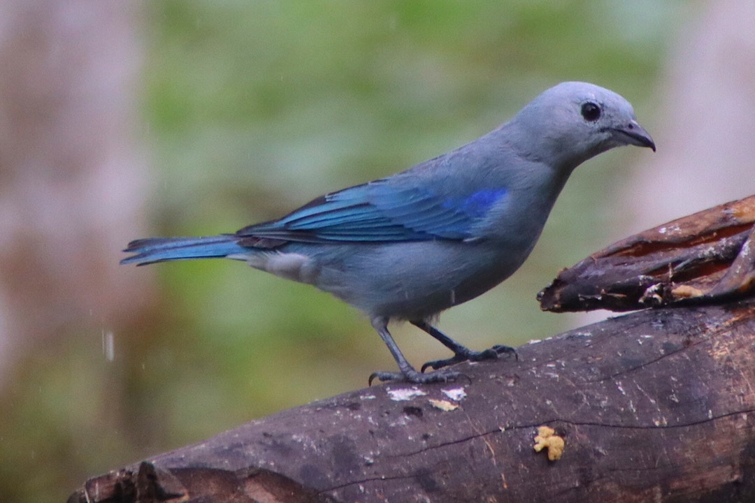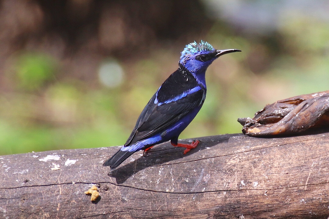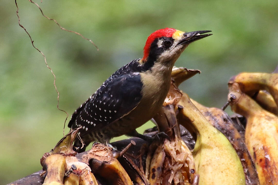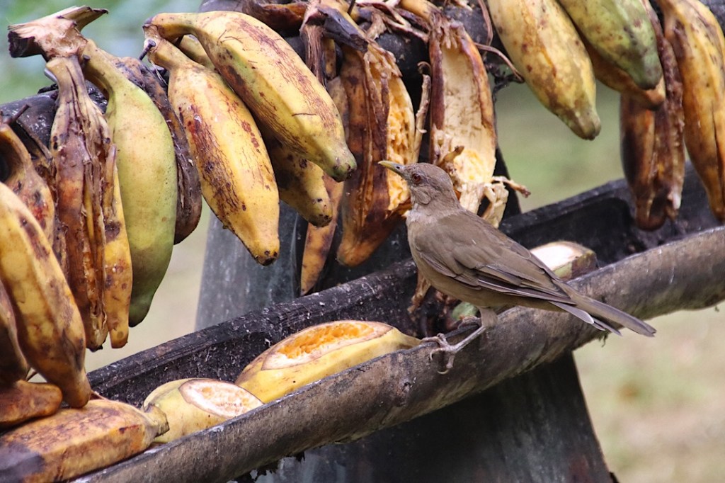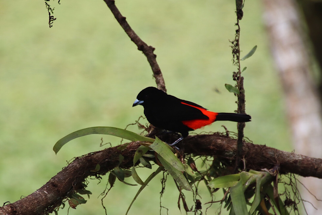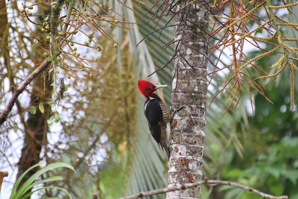 Zweimal müssen wir ein Stück zurück, weil wir den Weg doch verloren haben und da jeder Schritt in dem rutschigen und steilen Urwald wohl gesetzt sein will, wird es einer der anstrengendsten Hikes, den wir bisher gemacht haben. Aber es lohnt sich. Vögel bekommen wir zwar nur wenige zu sehen, aber neben dem Klopfen von einigen Spechten hören wir vor allem immer wieder den auffälligen Ruf des Montezumastirnvogels. Den kennen wir (wie die Erdbeerfröschchen) schon aus Costa Rica. Leise nähern können wir uns auf diesem schwierigen Geläuf leider nicht, und so verstecken sich die schönen etwa 50 cm großen Vögel mit ihrem im Flug auffallend gelben Schwanz und der roten Schnabelspitze ziemlich erfolgreich vor uns. Einen erwischen wir aber doch einigermaßen vernünftig mit der Kamera: