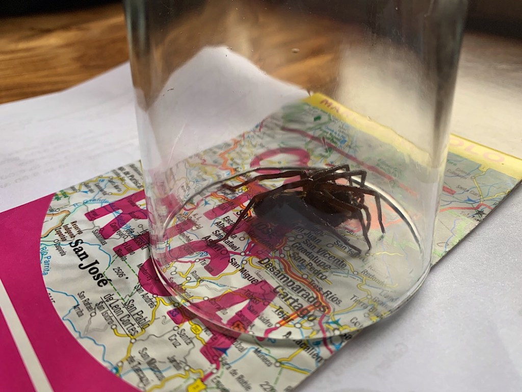 Inzwischen rutschen wir die Steigungen mehr oder weniger rauf und runter. Und ich habe ein Stöckchen in der Hand, mit dem ich uns den Weg zum Wizard Beach freizaubere. Immer schön auf und ab bewegen, der kleine Zauberstab ist wirklich wichtig geworden. Die giftigen Spinnennetze der Goldenen Seidenspinne sind zwar für Menschen völlig ungefährlich, aber eben doch lästig und die Spinnen selbst auch ziemlich eindrucksvoll. Die größte die wir sehen ist mit Beinen etwa handtellergroß. Im Hintergrund sieht man schon gleich die nächste.