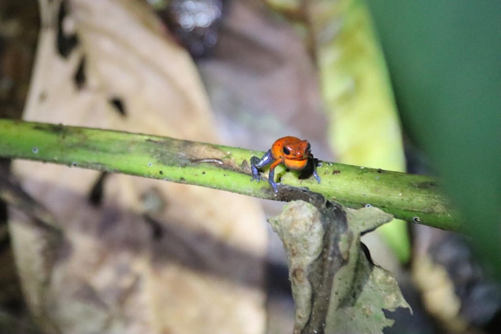 So kann man sich irren! Dabei verläuft der erste Teil des Anstiegs sogar noch durch das Dorf, also auf Wegen. Danach geht es auf einem Pfad weiter durch den Wald, ab und zu mal eine Hütte, Bananenplantagen, es bleibt bis hier hin einfach. Der Weg teilt sich, ein Wegweiser möchte uns nach rechts zu Strand schicken. Aber geradeaus geht es auch, auf dem Kamm des Bergrückens. Das ist der Weg, den wir uns ausgesucht haben, denn er beinhaltet sowohl den Gipfel als auch die Nordspitze der Insel und führt mit diesem Umweg am Ende auch zum Wizard Beach. Weiter, jetzt ein bisschen bergauf und bergab, wird der Weg immer schwerer zu erkennen, er ist offenbar nicht mehr oft benutzt. Einzelne kleine Felder mit Bananenstauden wirken unbewirtschaftet, der Wald wird dichter. Dafür springen um so mehr Frösche um unsere Füße. Hatten wir zuvor (auch bei dem Hike gestern) immer hohe spitze Schreie ausgestoßen, wenn wir endlich einen der kleinen roten Pfeilgiftfrösche zu sehen bekamen, müssen wir jetzt zunehmend aufpassen, nicht auf sie drauf zu treten.