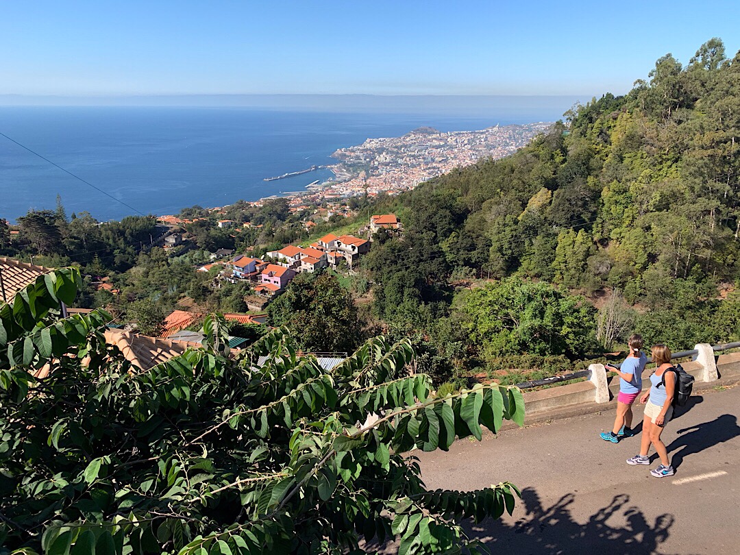 Und tatsächlich, nach gut 20 Minuten, in denen sich der Bus der Linie 47 in Serpentinen den steilen Hang hinauf bis zum Garten Quinta do Palheiro Ferreiro an der Stadtgrenze hinaufschraubt, stehen wir am Einstiegspunkt mit fantastischem Blick über Funchal und können unten die große Hafenmole erkennen.