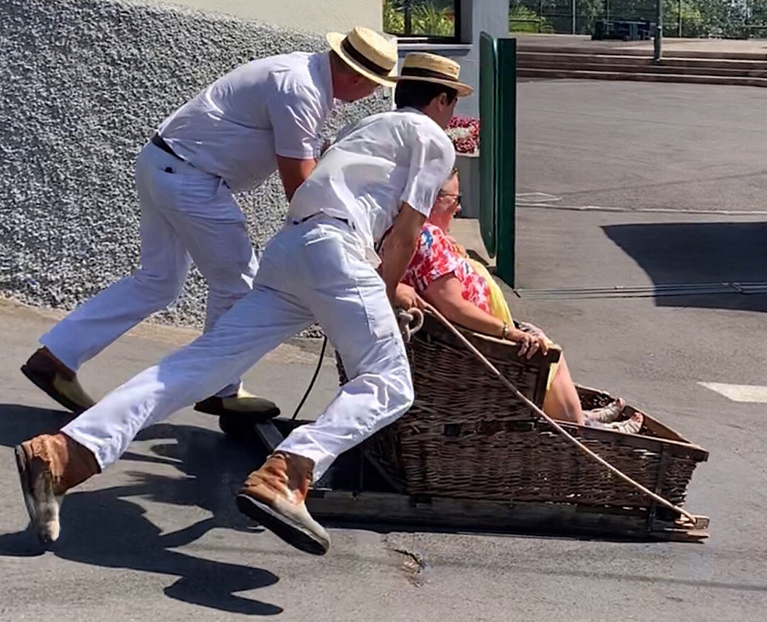 Nur das letzte Stück führt von der Levada fort erst steil bergab und dann auf der anderen Seite des Tales wieder hinauf bis zur Bergstation der Seilbahn 🚡. Von dort aus könnte man per Schlitten auf der Straße hinuntergleiten, traditionell sozusagen (früher gab es statt der Seilbahn scheinbar eine besondere Eisenbahn):