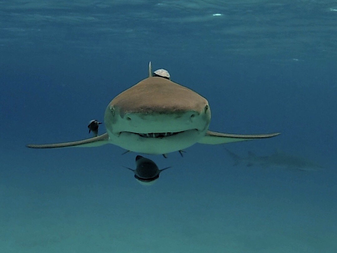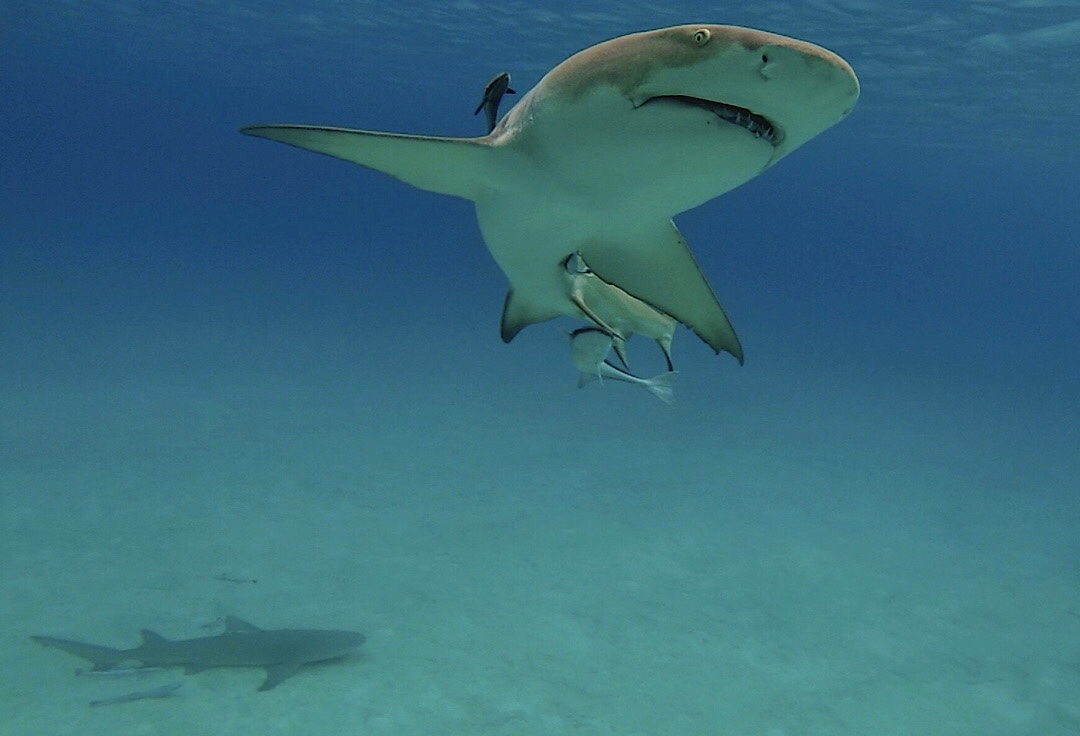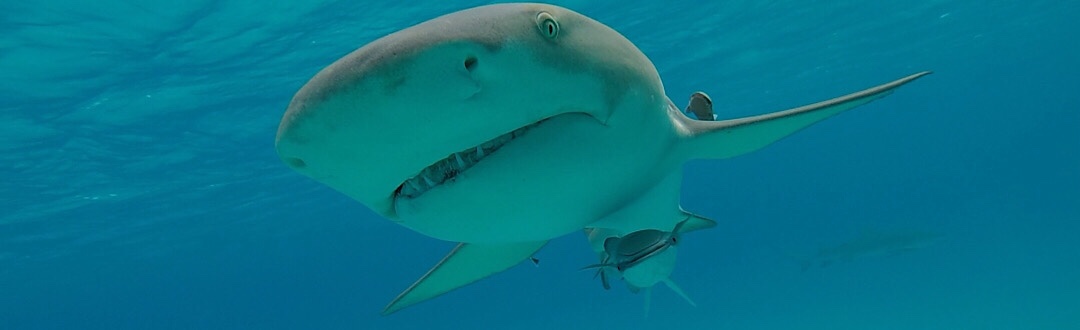 Einmal erspähen wir sogar zwei Zitronenhaie (die werden etwa gut 3 m lang) und einen Ammenhai (wird über 4 m lang) gleichzeitig, aber vor die Kamera kriegen wir sie bisher nur einzeln. Wir schätzen, das die von uns gesehenen Exemplare noch nicht ganz ausgewachsen waren (vielleicht jeweils etwa einen Meter kürzer).
