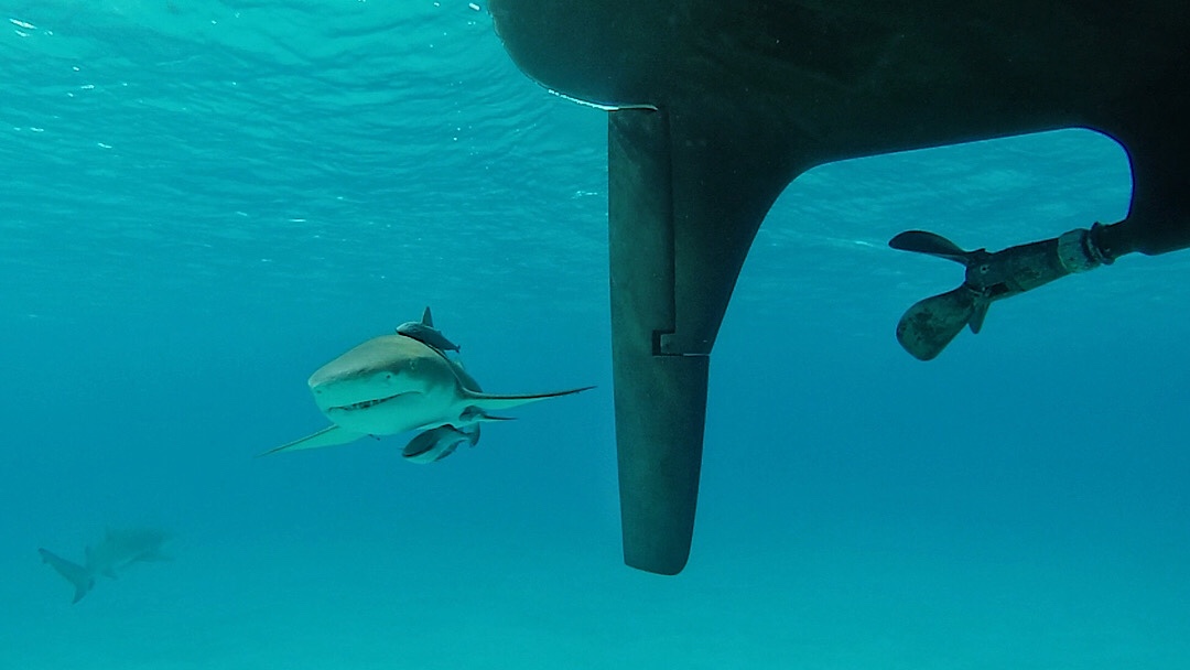 Spannend gestaltet sich auch die Besuchsfahrt hinüber zur Amalia, wo wir ja zum Mahi-Mahi eingeladen sind. Helena hat den unterwegs gefangenen Fisch am Abend in der Pantry noch mal abgespült. Das reicht um Steve schnell von seiner Reinigungsarbeit am Propeller wieder ins Cockpit zu scheuchen, denn sogleich leisten ihm drei Zitronenhaie unter dem Schiff Gesellschaft (und sie wirken ein bisschen aufgeregt). Auch unser Bad fällt dadurch ziemlich kurz aus. Aber: eine gute Stunde später scheinen die nun schon wieder sehr ruhigen Haie gemeinsam unter der Flora nachzuschauen, ob hier nicht auch Fischabfälle entsorgt werden. Verständlich, sehen die beiden Schiffe doch von unten identisch aus 😉