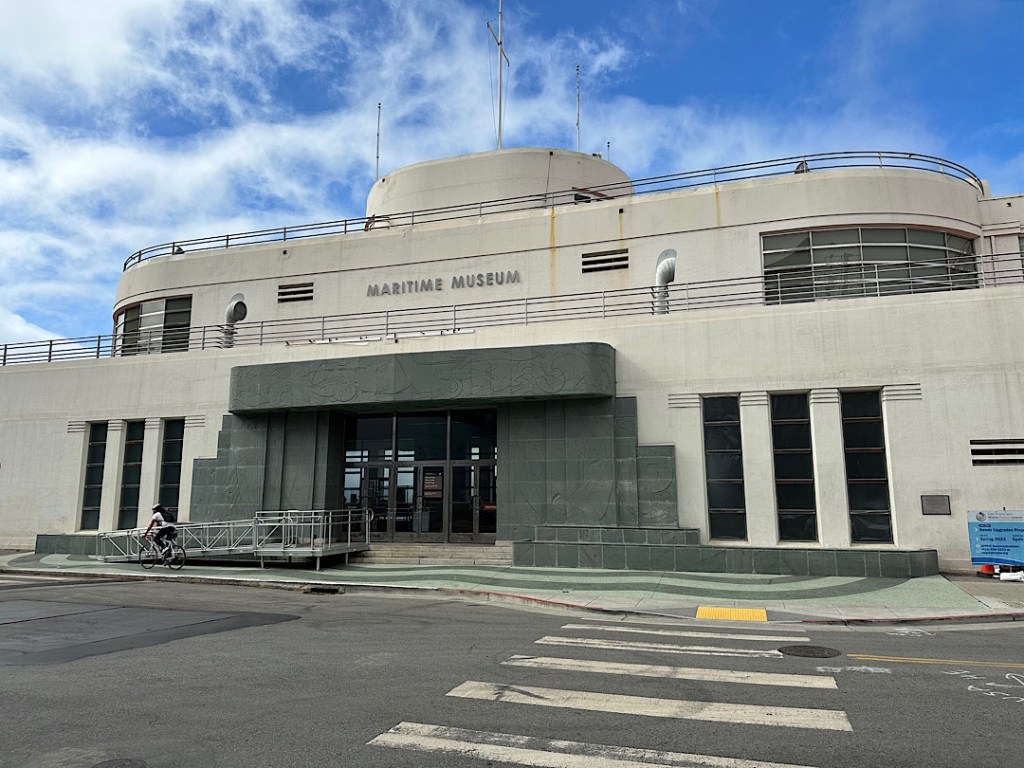Direkt am Ankerplatz im Aquatic Park liegt das Maritime Museum. Das beinhaltet zum einen den Hyde Street Pier. Mehrere historische Schiffe am Steg im Osten der Bucht, neben Segelschiffen auch Raritäten wie einem Dampf- und einem Schaufelrad-Schlepper sowie einer Schaufelrad-Fähre. Das heben wir uns aber für unseren nächsten Besuch an diesem Ankerplatz auf. Zum anderen ist da das Aquatic Park Bathhouse Building, auch bekannt als “Palace for the Public”. 1939 erbaut, war es konzipiert als öffentliches Badehaus mit Umkleiden und Schließfächern für Hunderte von Schwimmern sowie öffentlichen Duschen, die durch Lichtschranken aktiviert wurden, aber auch einem Restaurant und sogar einem Notfall-Krankenhausbereich.