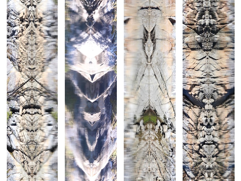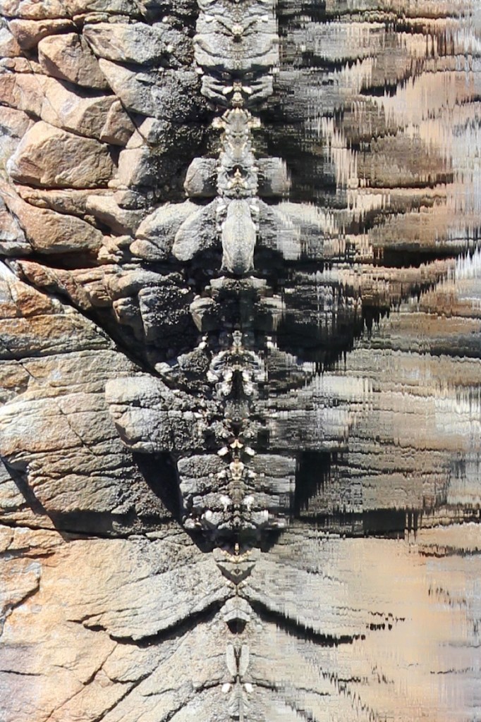 Quatsch! Unsere Phantasie schlägt Purzelbäume, aber es sind natürlich nur um 90 Grad gedrehte Spiegelungen der Felsen an der Wasserlinie hier am Ankerplatz in Prideaux Haven. Trotzdem, von mystischen Schlangen bis zu Vogelmenschen oder Katzenköpfen bis hin zu Comic-Figuren lässt sich für uns alles darin erkennen. Nach den Wolken-Tierchen auf der Atlantiküberquerung und den Eisskulpturen in Alaskas Glacier Bay sind jetzt also mal die Felsen dran für kurzweilige Spielchen mit der Vorstellungskraft.