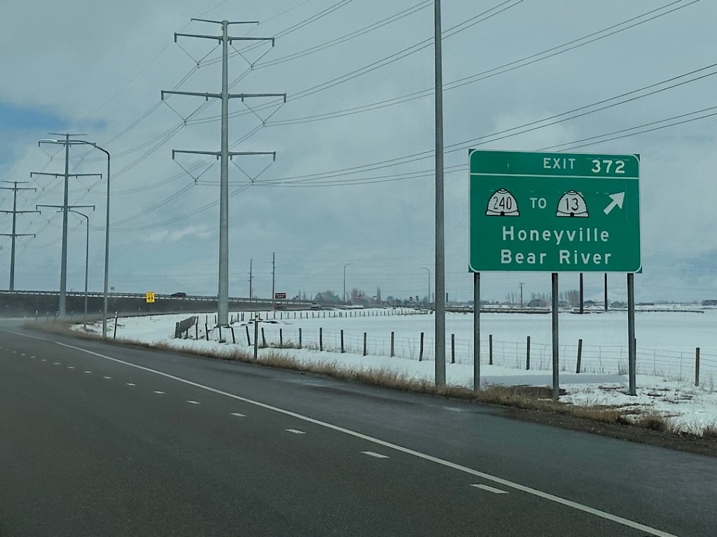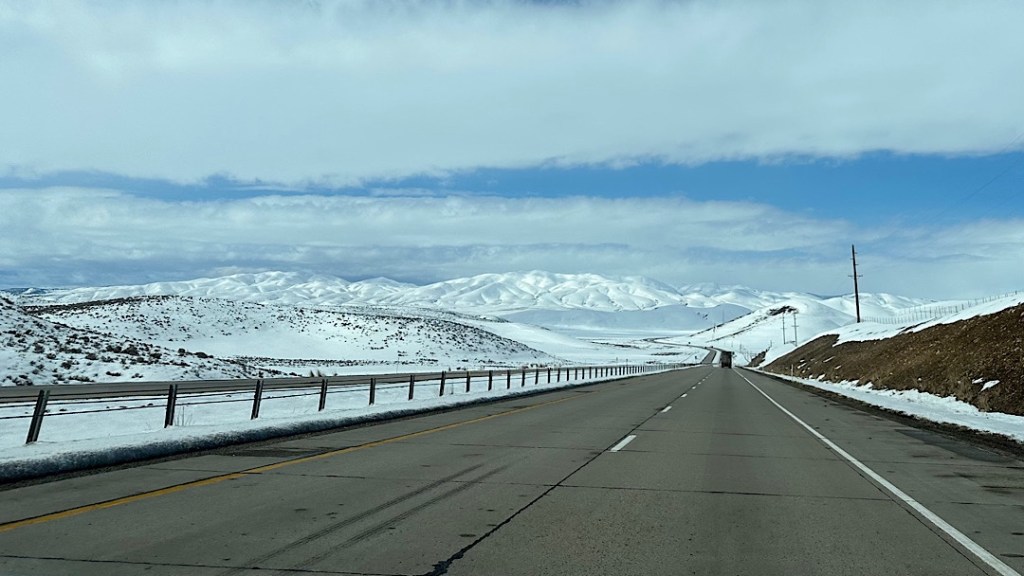 Mal wieder Strecke: wir verlassen Park City und fahren zunächst durch die schneebedeckten Berge. Über die Rocky Mountains, durch Salt Lake City hindurch, am Großen Salzsee und Industrieanlagen vorbei und weiter durch die scheinbar endlose Landschaft, erst einmal ins südliche Idaho.