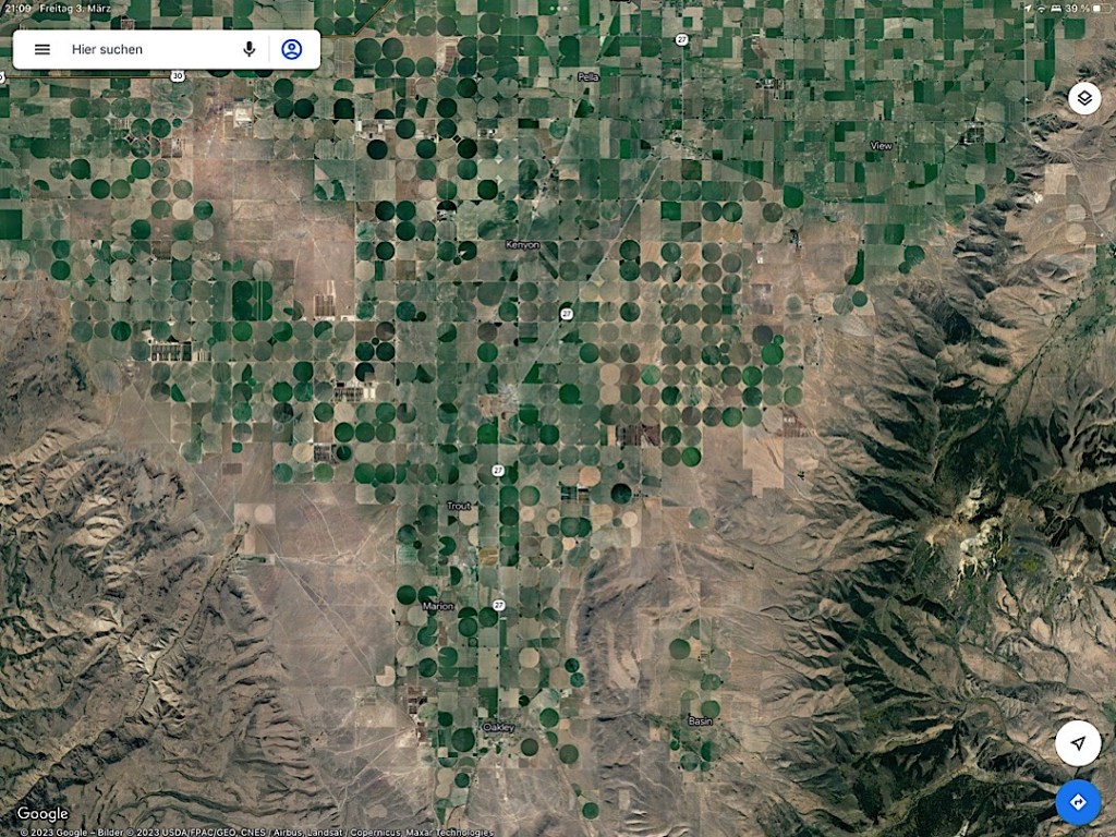 Aber erst im Google Earth Bild wird deutlich, welche Dimensionen diese Bewässerung hat und welche grafischen Muster dabei in der Landschaft erzeugt werden: